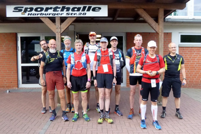 Es soll brauchbares Laufwetter geben und kein Regen. Oder zumindest erst ziemlich spät. Und sooo warm soll es auch nicht werden. Also kurz-kurz und leichtes Gepäck. Früh um 7 traben wir ab. So manche Absage in letzter Minute hat das Feld auf nur 9 Läufer reduziert. Ha, die Absager wissen gar nicht, was ihnen da entgehen wird.