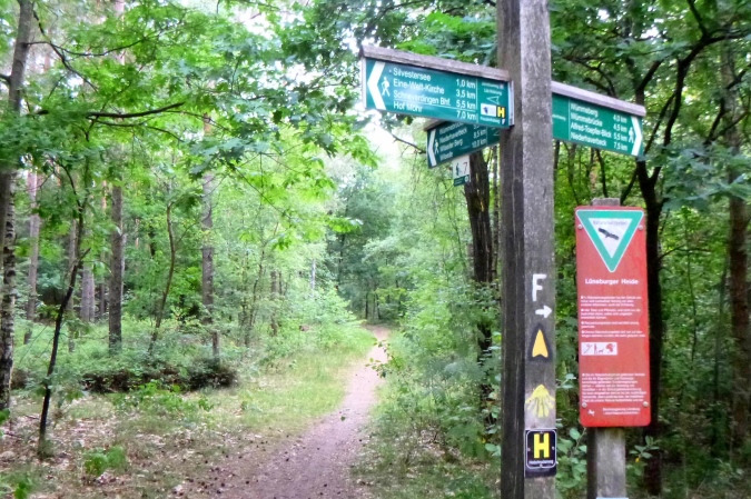 Ein Radfahrer ist entsetzt, als er mich sieht. Ob ich ein Ultra wäre. Ja klar. Wie, so schnell hier? Er käme ja kaum mit dem Markieren voran... Des Rätsels Lösung: zeitgleich und im selben Areal laufen aus Lüneburg kommend andere Ultras auf 100 km durch die Heide. Riesige Richtungspfeile, Tafeln, große VPs, Rotkreuz, Bergwacht, alles ist aufgeboten. Teilstrecken laufen wir auch, aber meist in Gegenrichtung. Obacht also. Natürlich ist unsere Strecke die viel schönere... ist doch klar!