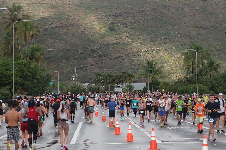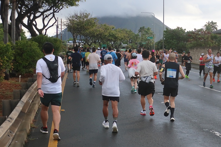 Mit Kegeln abgetrennt ist auf dem Highway eine zunächst noch leere Gegenspur. Auf dieser kommen schließlich wenige Schwarzafrikaner als Spitze des Feldes auf dem Rückweg nach Honolulu angeprescht. Und dann lange niemand mehr. Dann tröpfeln, zunehmend mehr, die Läufer des Verfolgerfeldes ein. Nur wenige haben sich den Pacern für 3:00 oder 3:30 Std. angeschlossen. Sehr kompakt ist weiterhin das Feld auf meiner Seite. Doch ist natürlich interessant zu beobachten, was sich auf der Gegenspur tut.
