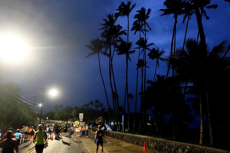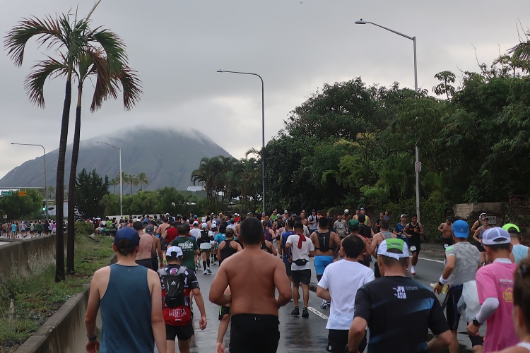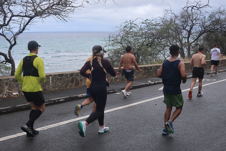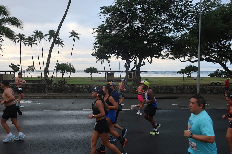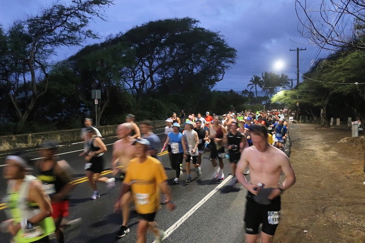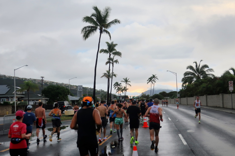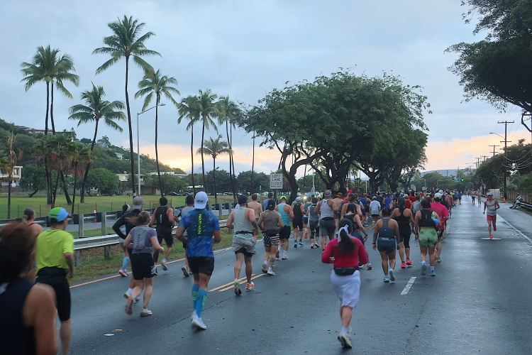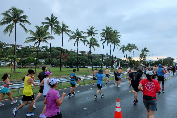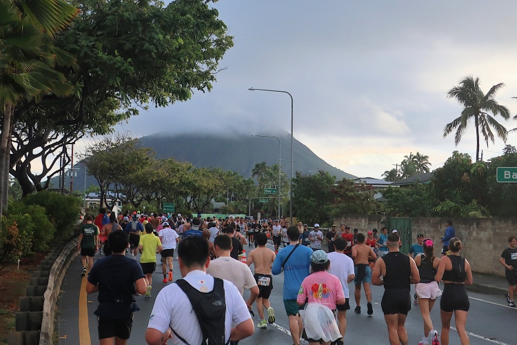 Es lohnt sich, den schweißtreibenden halbstündigen Weg hinauf zum „Gipfel“ am höchsten Punkt des Kraterrands auf sich zu nehmen und von dort den Ausblick auf Waikiki und die Küste zu genießen. Beim Marathon müssen wir das nicht, aber auch die Küstenstraße hält hier, am Fuße des Kraters, eine langgezogene spürbare Steigung bereit. Die Blöße, den Anstieg walkend zu bewältigen, gebe ich mir aber nicht. In der ersten Morgendämmerung bekommt die Landschaft immer mehr Kontur. Gleiches gilt für die weiterhin düsteren Wolken am Himmel, doch halten sie ihre Regenlast nunmehr zurück. Zumindest meist.