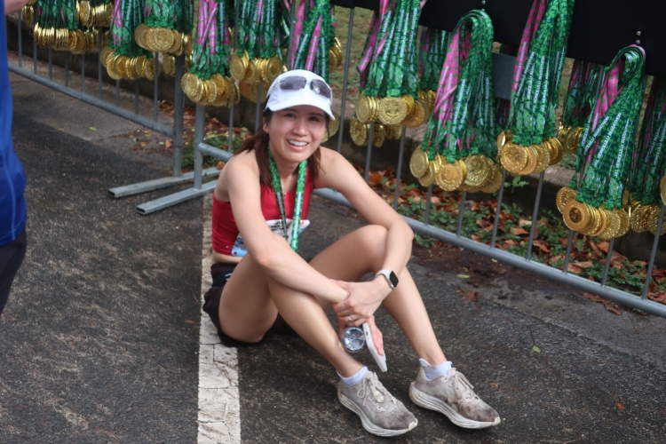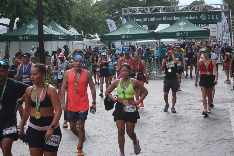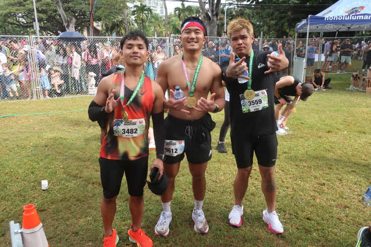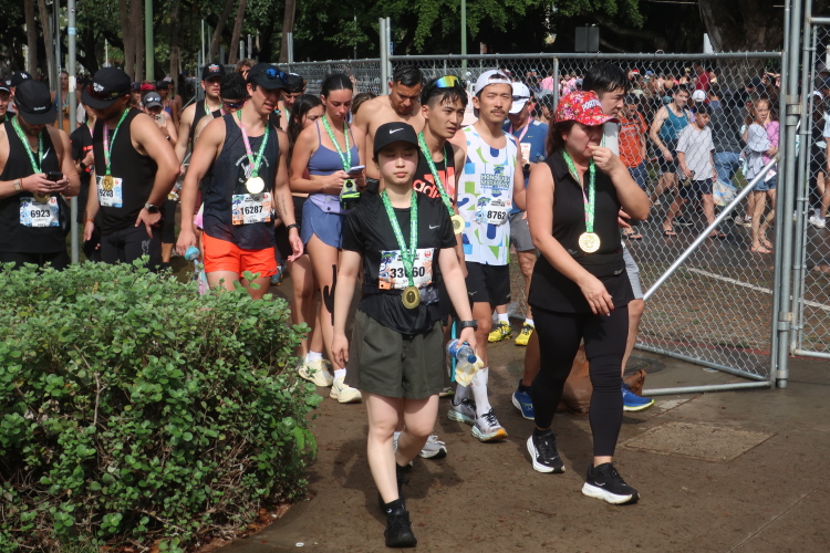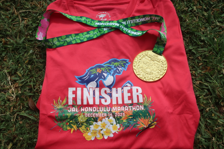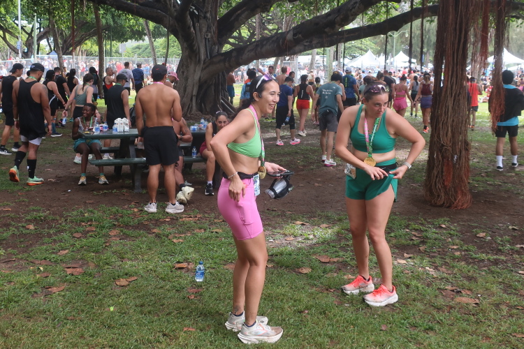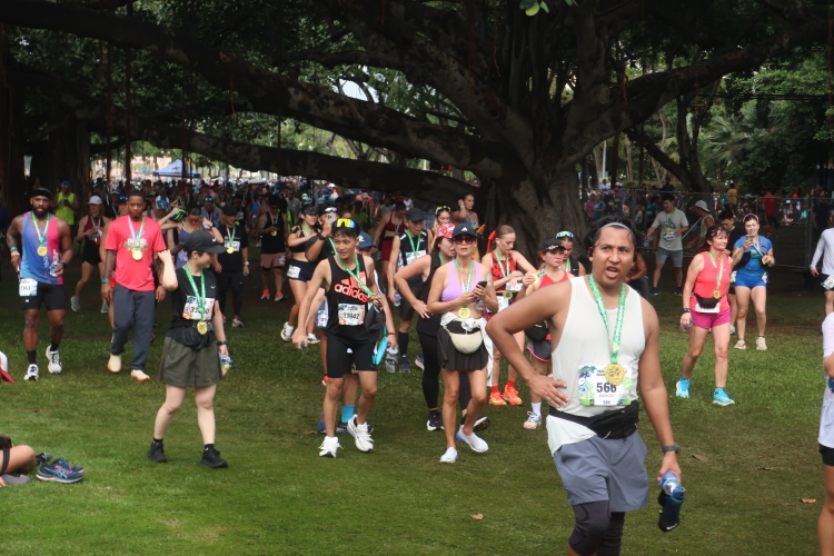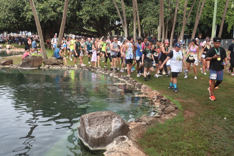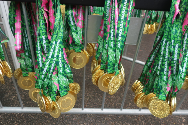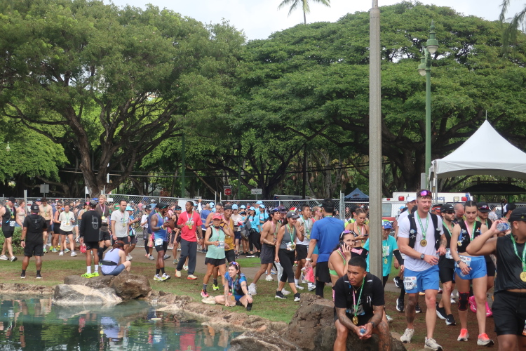 Die größte und goldglänzendste Finishermedaille meines Läuferlebens wird mir im Ziel umgehängt, bevor ich weiter durch den für die Einläufer mit Gittern abgeriegelten Zielkorridor und hinein in den wunderschönen Kapiolani Park mit seinen riesigen Banyans, Teichen und weiten Wiesenflächen gelotst werde. Ein farbenfrohes Finishershirt gibt es hier dann oberdrauf und endlich auch eine Kleinigkeit zu essen: Malasadas, eine hawaiianische Variante des in Bayern als „Auszogne“ bekannten Schmalzgebäcks, nur eben kleiner und richtig frisch, richtig fett, richtig lecker.