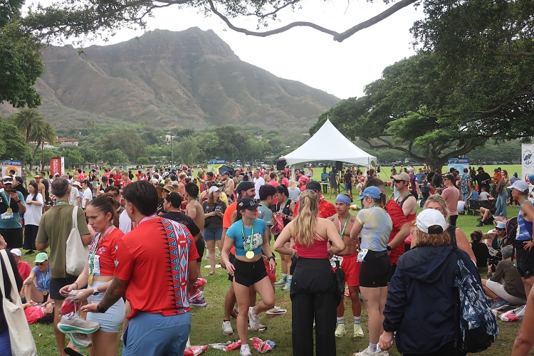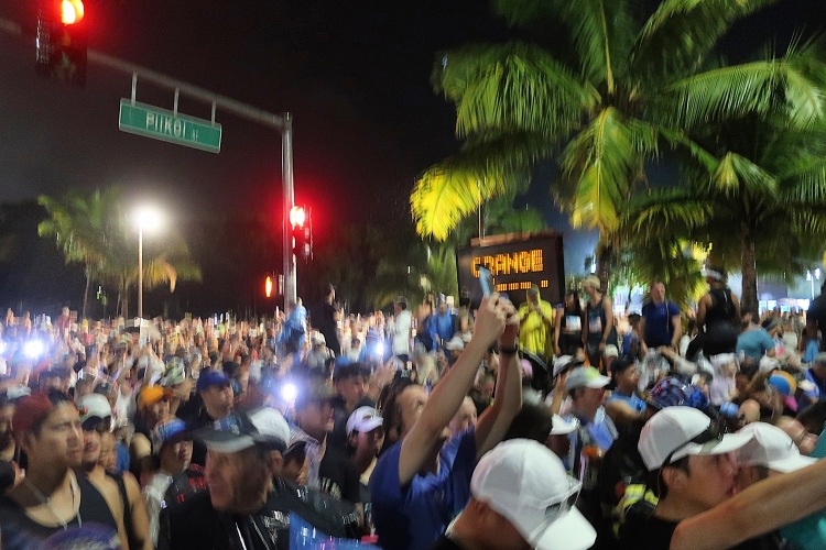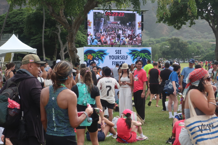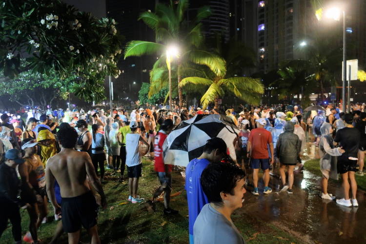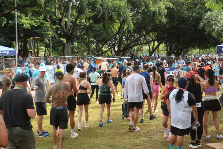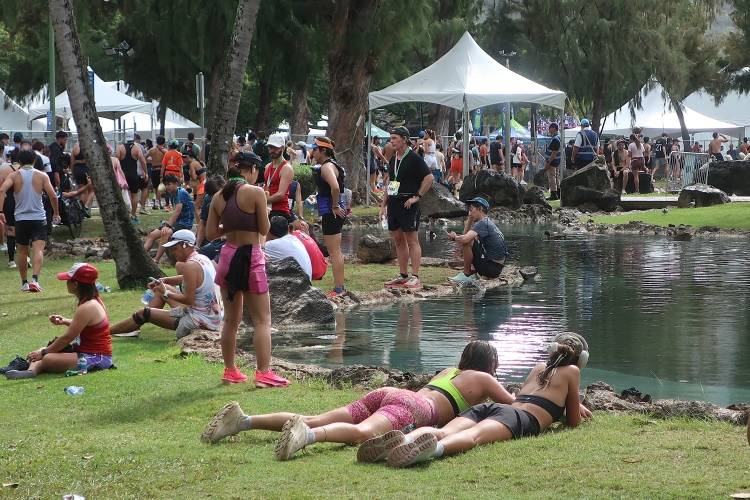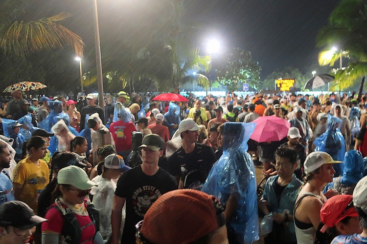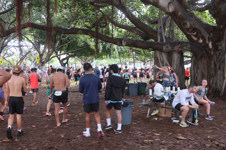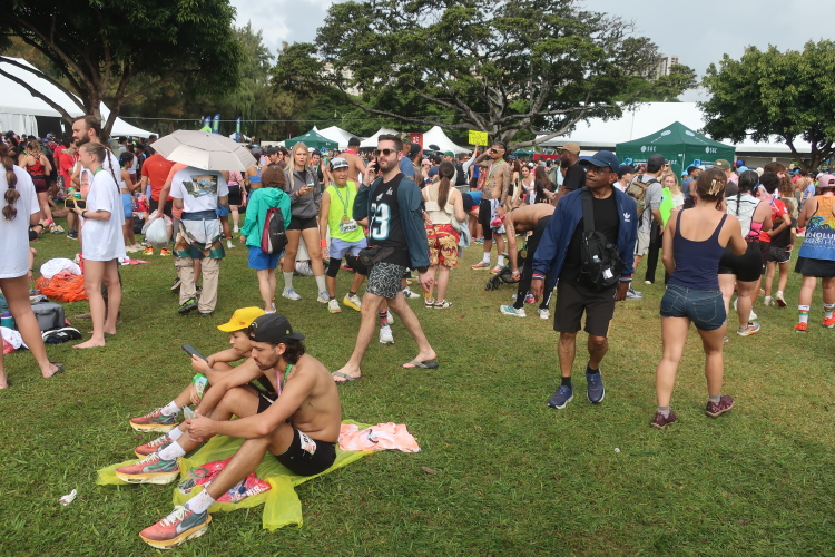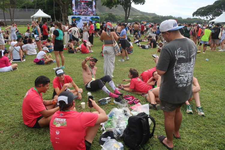 Eine unglaubliche Menschenschar, vor allem Finisher, aber auch deren Familien oder Freunde, bevölkern das weite Parkgelände, viele in den Wiesen liegend oder vor einer der zahlreichen Bilderwände mit Marathonemblem posend und ein Erinnerungsfoto schießend. Eine ausgelassene und entspannte Stimmung herrscht, ganz im Geiste von Aloha. Und dazu gehört auch, dass selbst dann, als nach über 14 Stunden bei Dunkelheit und strömendem Regen die letzten Finisher im Ziel einmarschieren, diese am Zielbogen noch mit Hallo und Beifall empfangen werden.