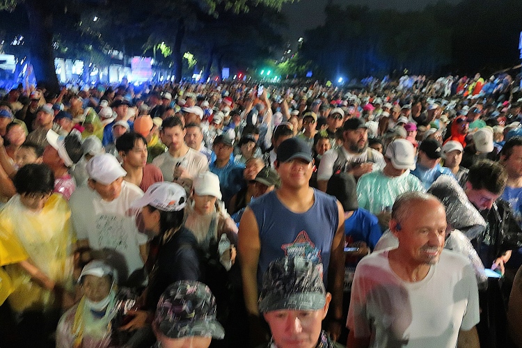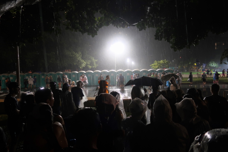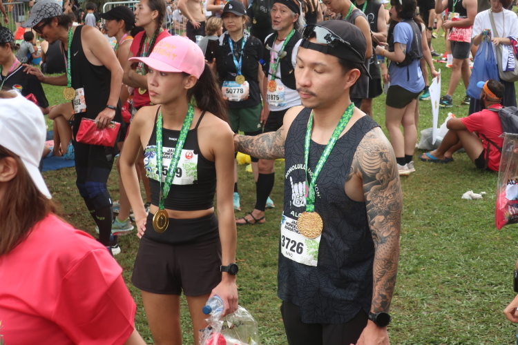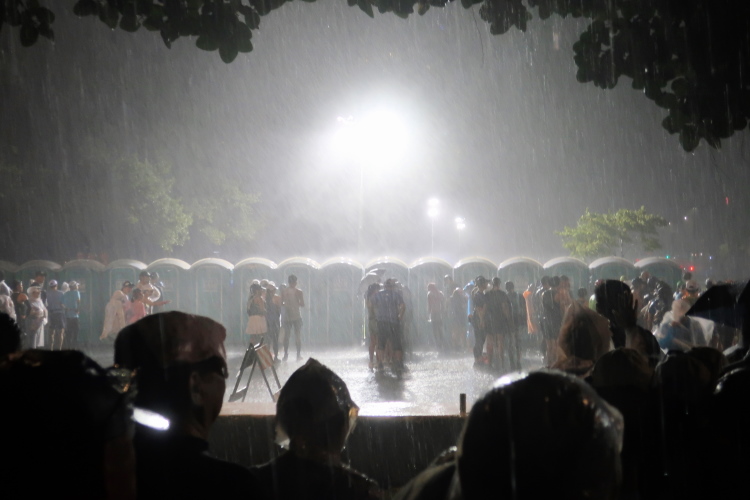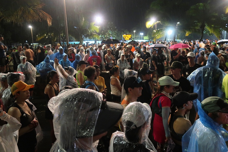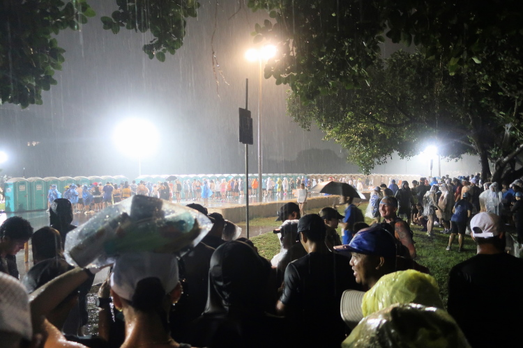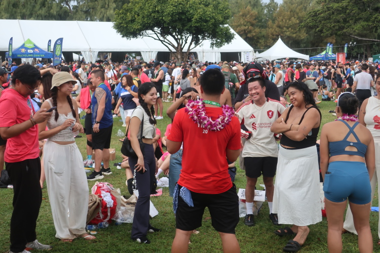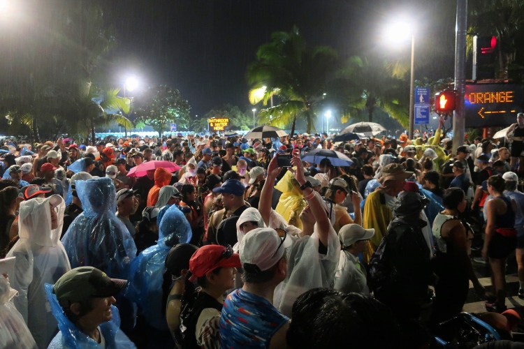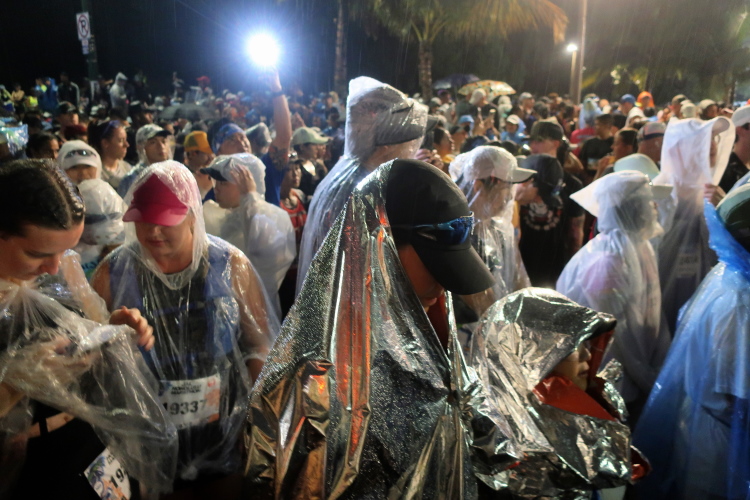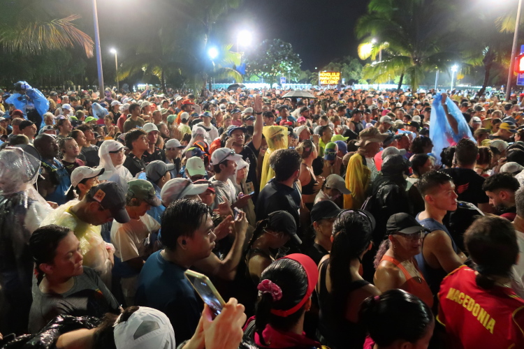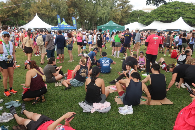 Eine unglaubliche Menschenschar, vor allem Finisher, aber auch deren Familien oder Freunde, bevölkern das weite Parkgelände, viele in den Wiesen liegend oder vor einer der zahlreichen Bilderwände mit Marathonemblem posend und ein Erinnerungsfoto schießend. Eine ausgelassene und entspannte Stimmung herrscht, ganz im Geiste von Aloha. Und dazu gehört auch, dass selbst dann, als nach über 14 Stunden bei Dunkelheit und strömendem Regen die letzten Finisher im Ziel einmarschieren, diese am Zielbogen noch mit Hallo und Beifall empfangen werden.