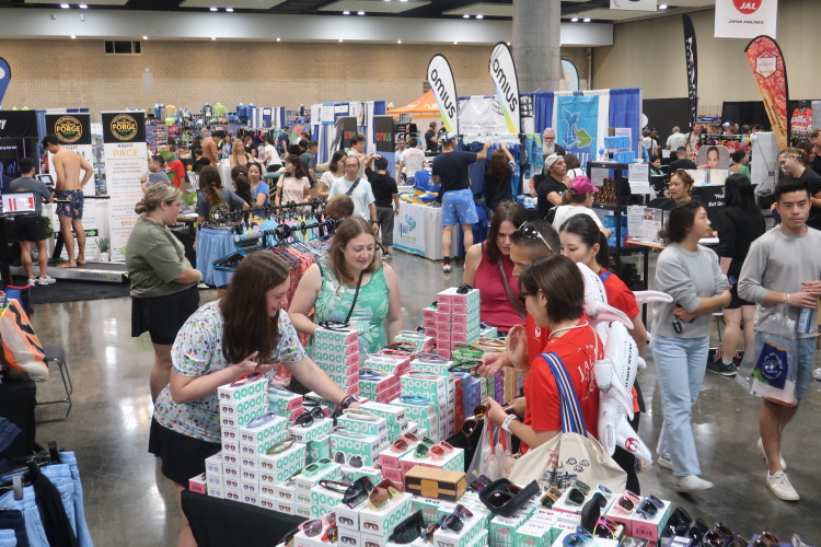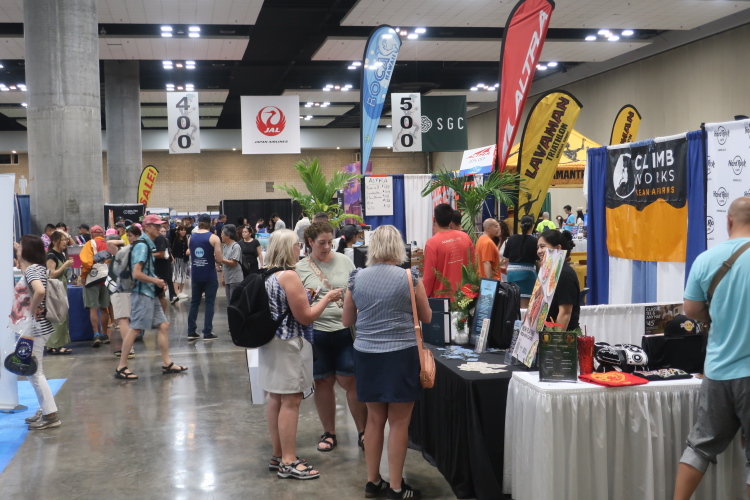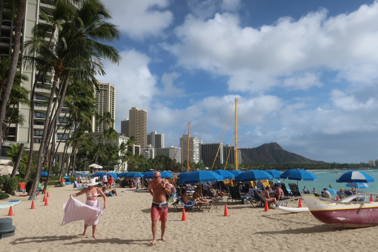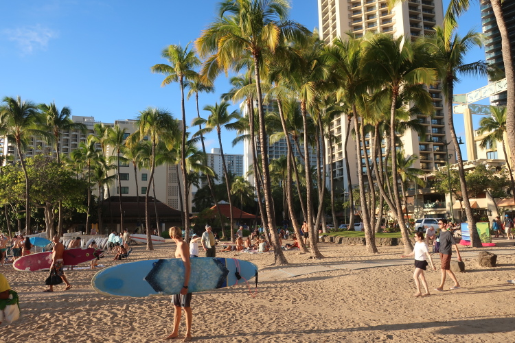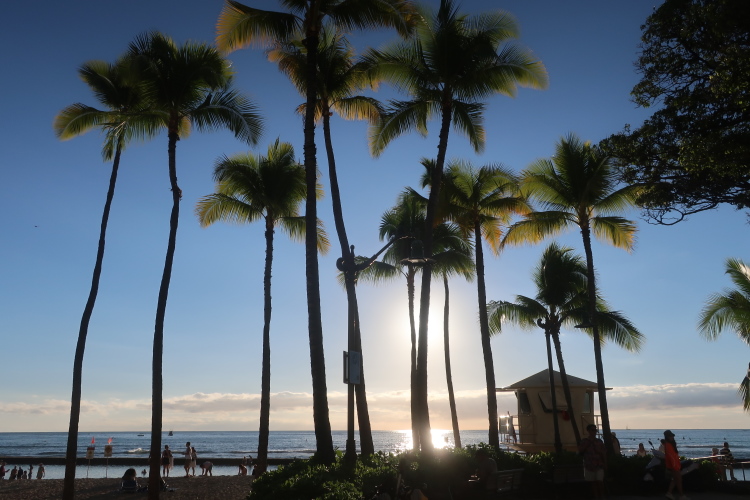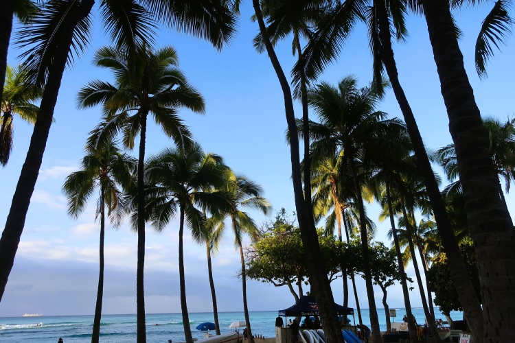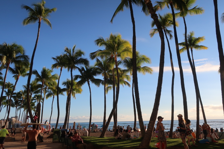 Allzu lange hält mich aber nichts mehr auf der Messe. Denn schöner als hier drinnen ist es dann doch, draußen unter den wiegenden Palmen am Waikiki-Strand zu flanieren, wo leichtest bekleidete Jogger/innen ihrer Marathonfitness den letzten Schliff geben.