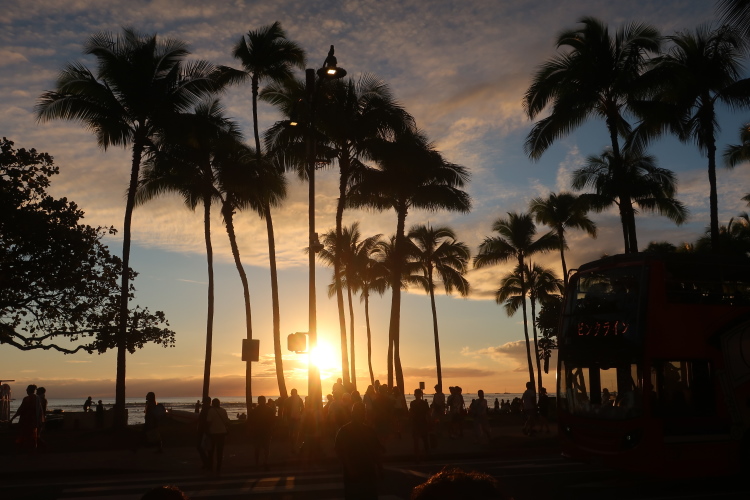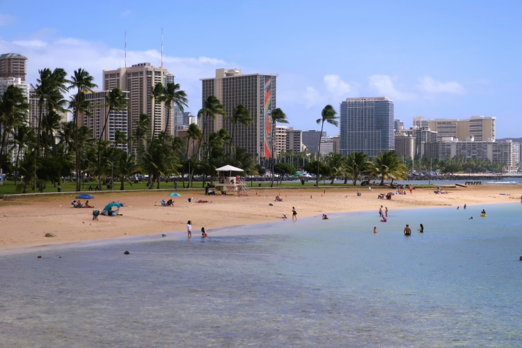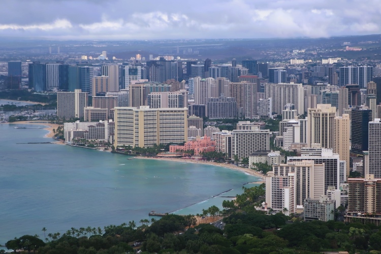 „Geschützte Bucht“ – nichts anderes bedeutet auf Hawaiianisch Honolulu. Und so ist es kein Zufall, dass ausgerechnet an dieser Stelle auf Hawaiis drittgrößter Insel O’ahu die Hauptstadt der Inselgruppe heranwuchs. Etwa 350.000 Menschen, in der Metropolregion gut eine Million Menschen leben hier. Und wären da nicht die berühmten vorgelagerten Strände, der markante Krater im Stadtbild und das grüne, vulkanisch geprägte Hinterland, würde man nur die eher beliebig-typische amerikanische Hochhaus-Skyline als stadtbildprägend wahrnehmen. Allerdings kommt hier dazu, dass allgegenwärtig üppiges tropisches Grün dem Häusermeer eine besondere, exotische Note verleiht.