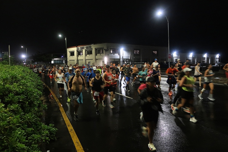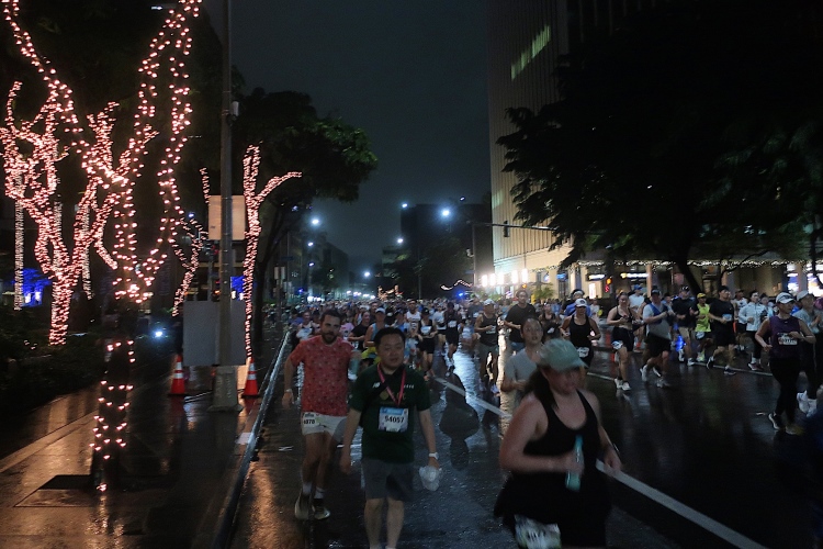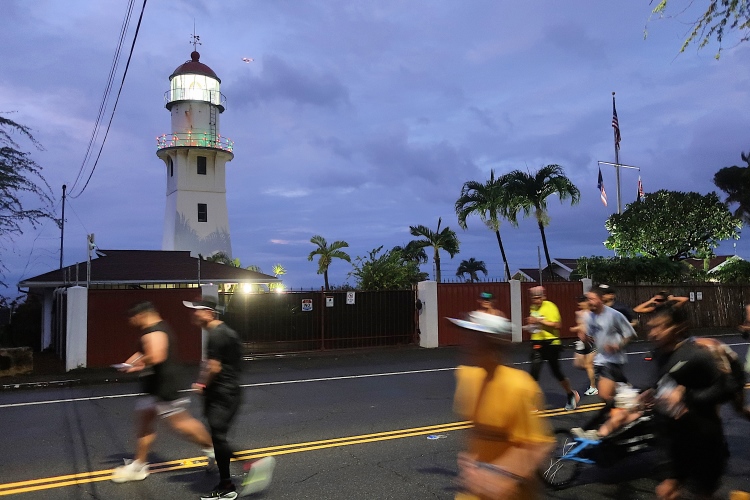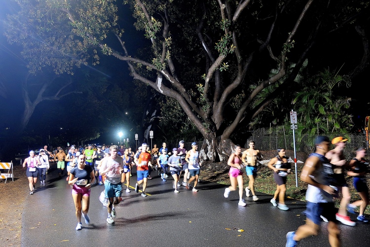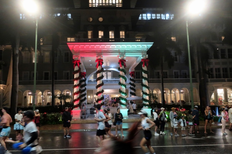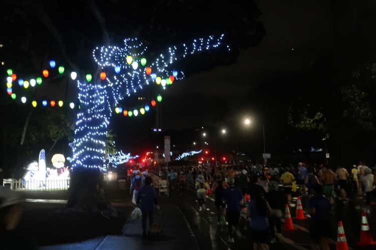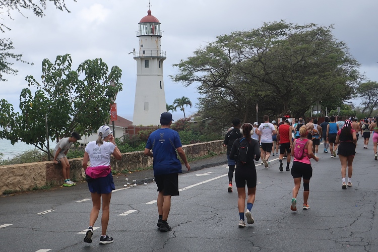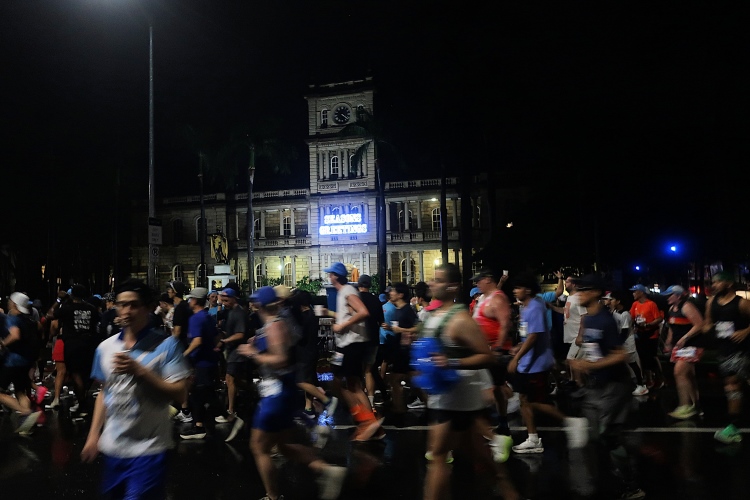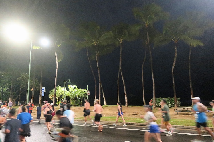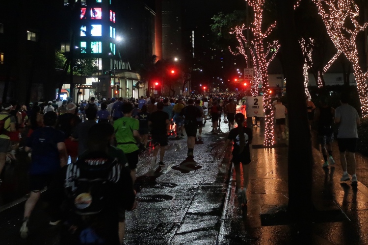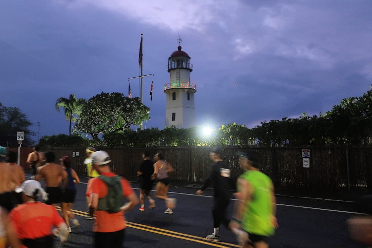 Die ersten Kilometer führen entlang des Hafens Honolulus bis in die Innenstadt hinein. Stockfinster ist der Himmel noch, sodass sich die Sightseeing-Eindrücke in Grenzen halten. Auch wenn ich es langsam angehen lasse, bin ich zu meinem Erstaunen doch deutlich schneller als die meisten um mich herum. Und nicht wenige gehen das Ganze von Beginn an walkend an. Das ist eben Honolulu! So muss ich mich aufs Slalomlaufen konzentrieren, um halbwegs mein Tempo laufen zu können. Nicht entgeht mir dennoch der historische Aloha Tower. Der zehnstöckige Uhrturm am Hafen, ein Wahrzeichen der Stadt, war bei seiner Errichtung im Jahr 1926 mit 56 Metern das höchste Gebäude Hawaiis. Angestrahlt wird er in der Nacht, nur ist er leider zu weit von der Straße entfernt, um viel von ihm zu sehen zu bekommen.