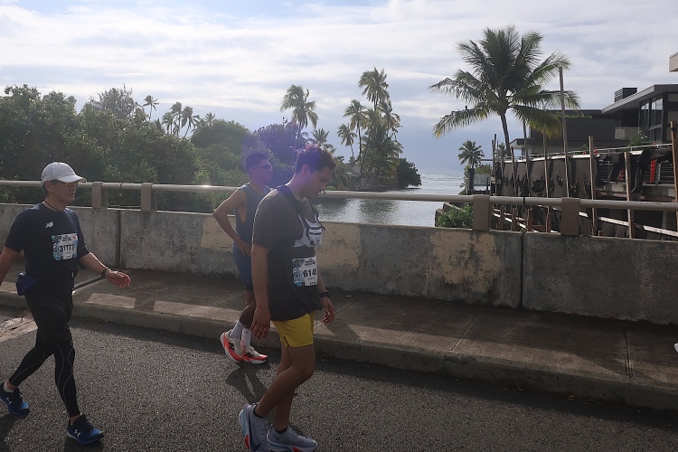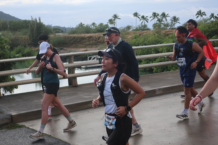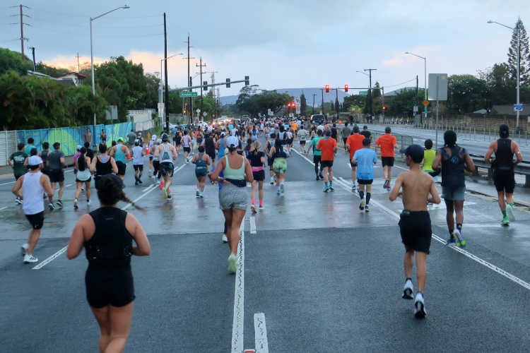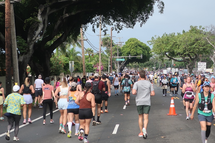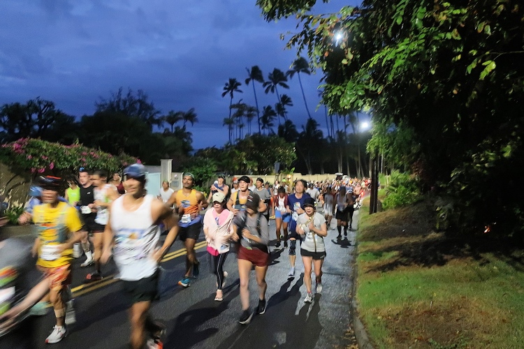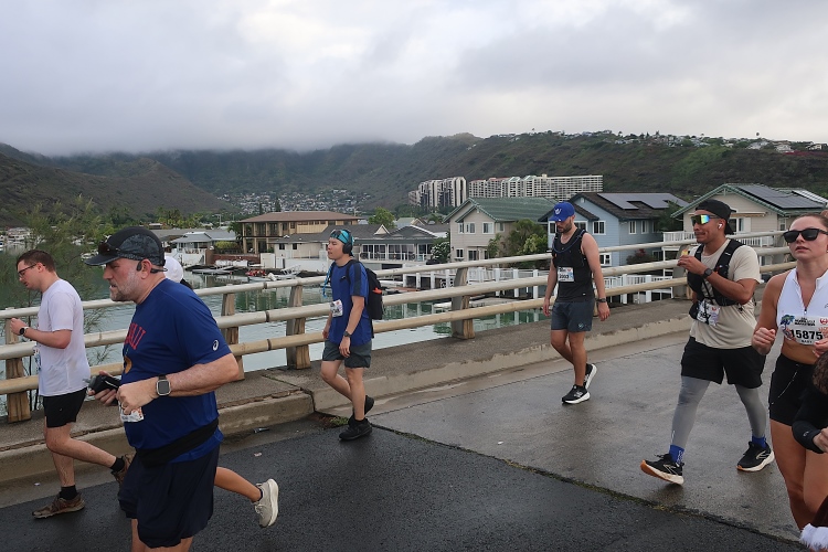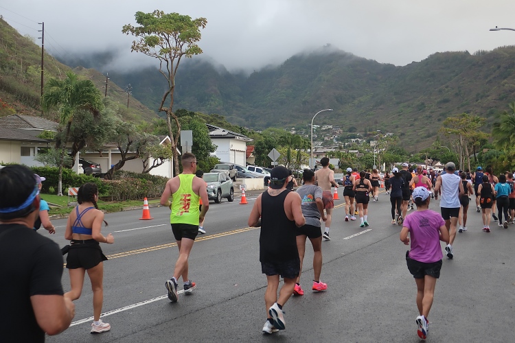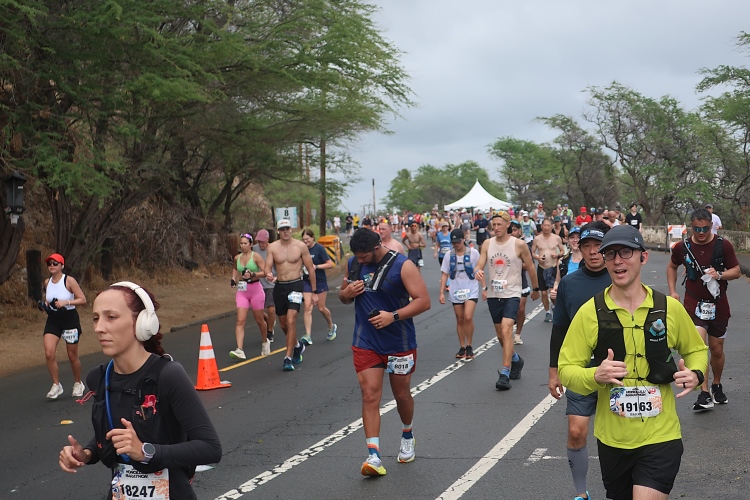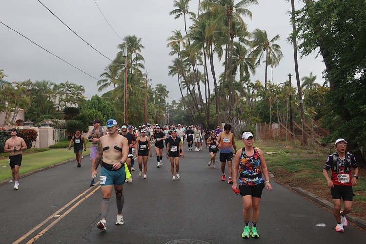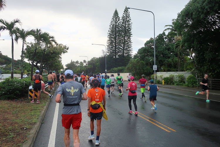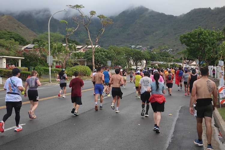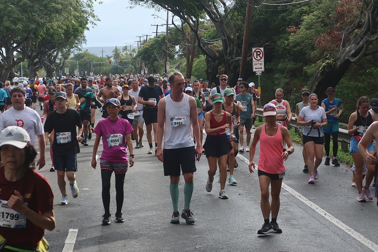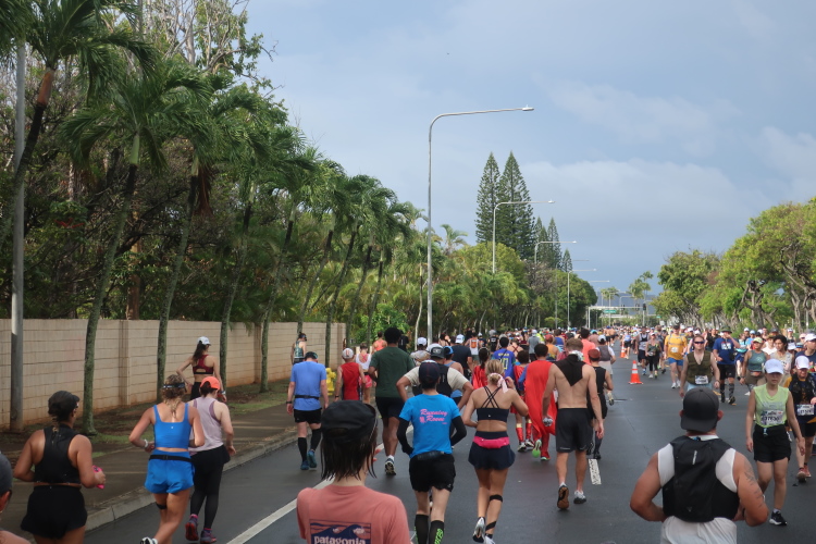 Bis zur Halbmarathonmarke bin ich läuferisch gut dabei, dann merke ich, dass es mir immer schwerer fällt, selbst ein langsames Lauftempo zu halten. Aber ich befinde mich in bester Gesellschaft. Und so ist das gar nicht so frustrierend und ich merke auch, dass das viele Wandern zuletzt auf La Palma und Maui mich konditionell beim schnellen Schritt unterstützt.