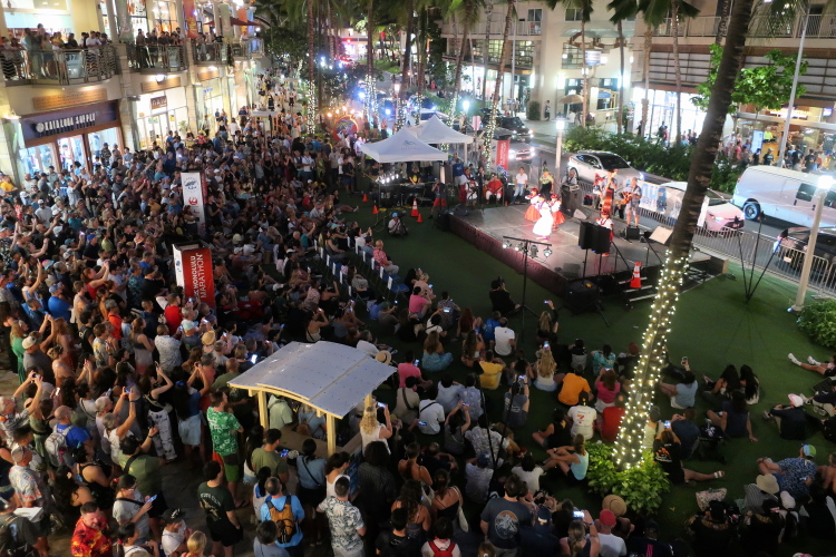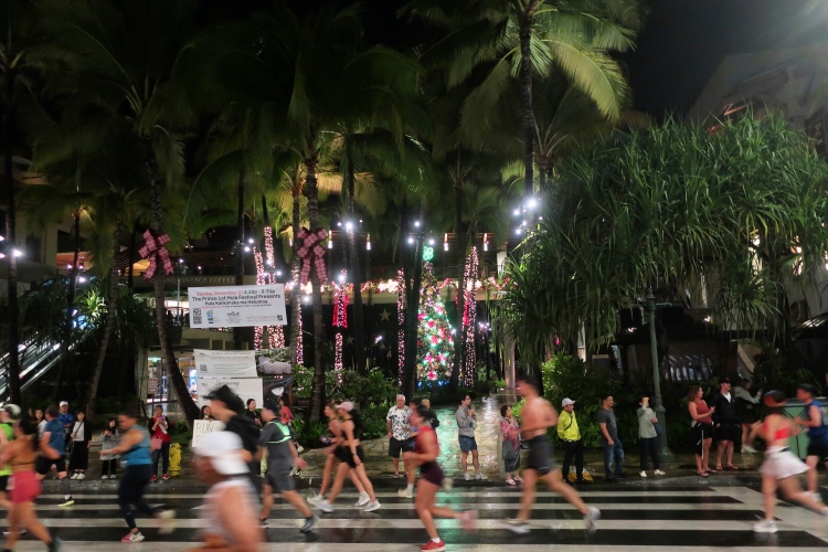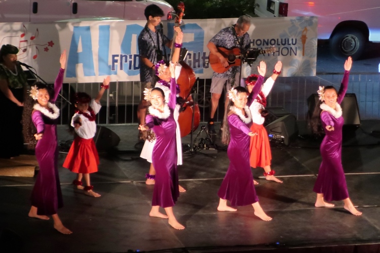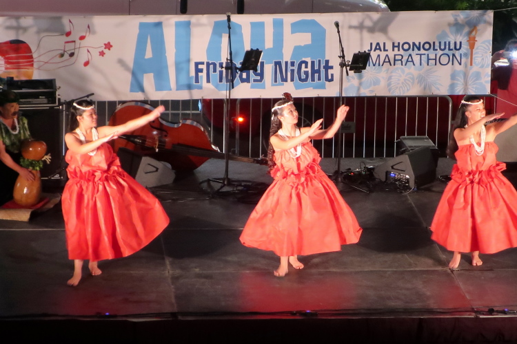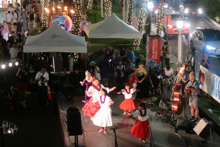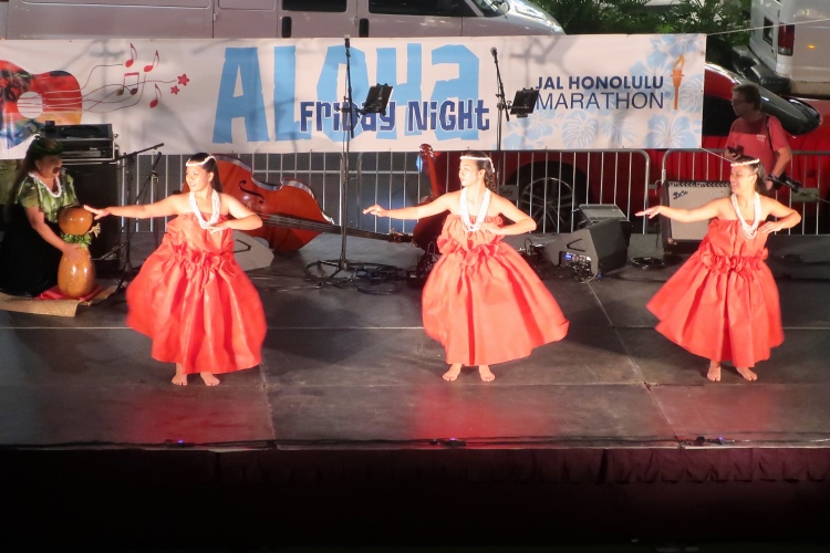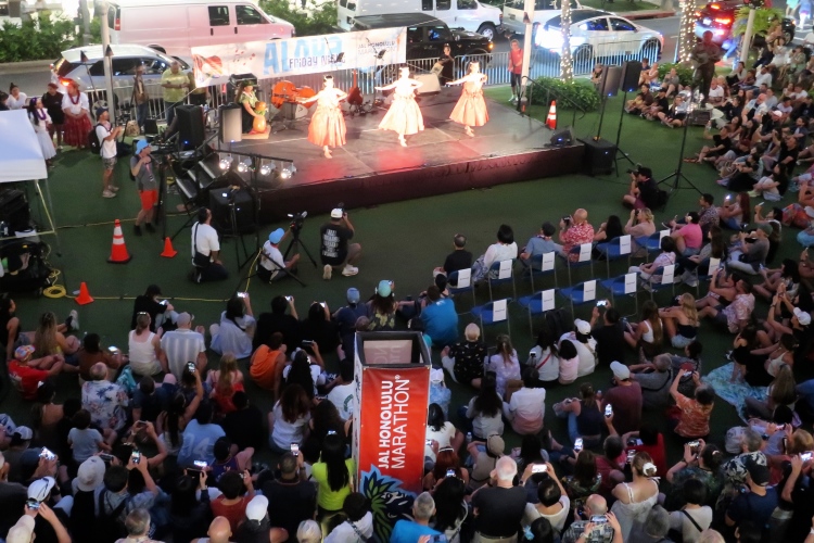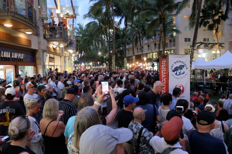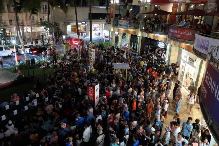So etwas wie eine Carboloading Party, wie früher einmal, gibt es nicht. Allerdings sind die Läufer, sozusagen als Kick Off zum Marathonwochenende, zur Aloha Friday Night geladen. Auf der strandnahen Waikiki Beach Walk Plaza wird am Freitag in den frühen Abendstunden etwas für das marathontouristische Auge und Ohr geboten: