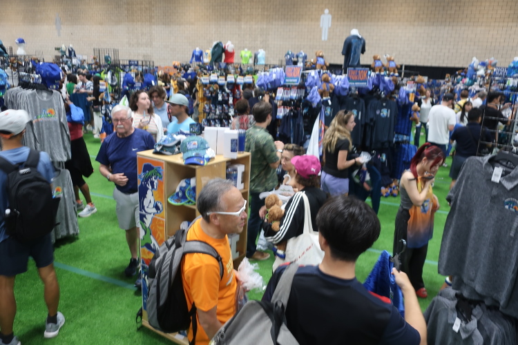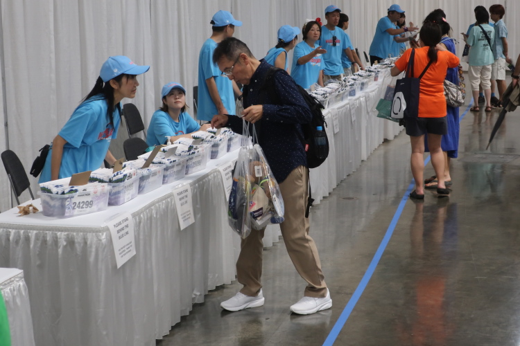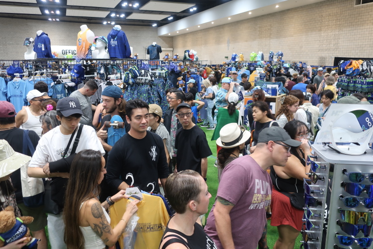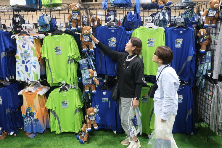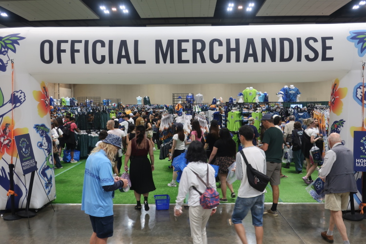 Ich nutze gleich den Donnerstag, in der Hoffnung, dass sich der Andrang noch in Grenzen hält. Denn immerhin 42.000 Anmeldungen haben die Veranstalter für 2025 stolz verkündet, davon 28.000 auf den Marathon entfallend. Und tatsächlich: Überaus entspannt geht es an der schier endlos langen Reihe der Ausgabetische für die Startnummern zu. Ohne Warten bekomme ich meine Nummer. Nach kurzer Verifikation per Nummer per Scanner werde ich sogleich weitergelotst durch ein großes Tor: „Official Merchandise“ steht in unübersehbaren Lettern darüber. Und urplötzlich wähne ich mich in einer Art „Black Friday“-Shopping-Getümmel. Überaus vielfältig und üppig ist das Angebot an Merchandise-Artikeln. Kaum jemand der dichtgedrängt herumwuselnden Besucher kann der Versuchung widerstehen, mindestens eines der farbenfrohen Accessoires in den Starterbeutel zu packen und sich in die lange Schlange an den 15 Kassen einzureihen.