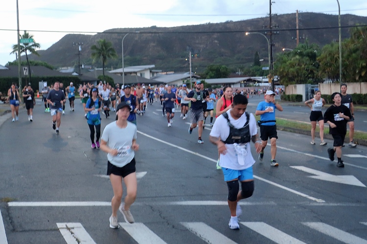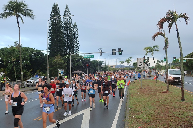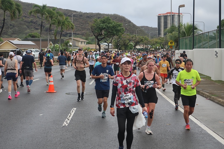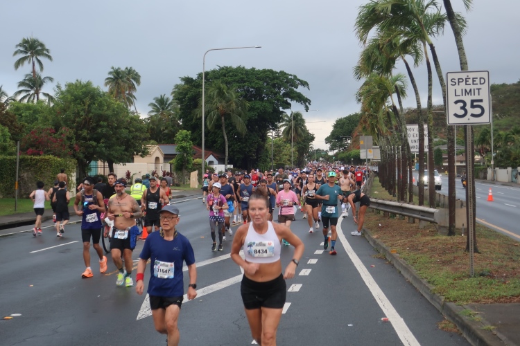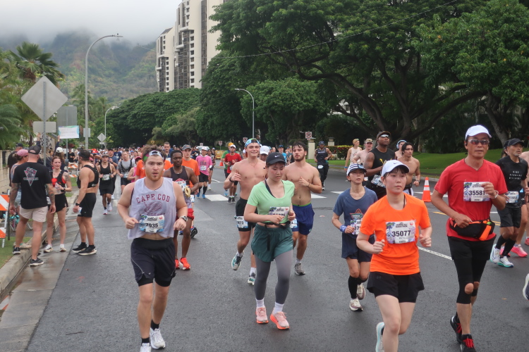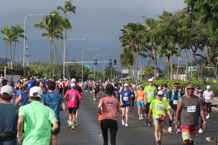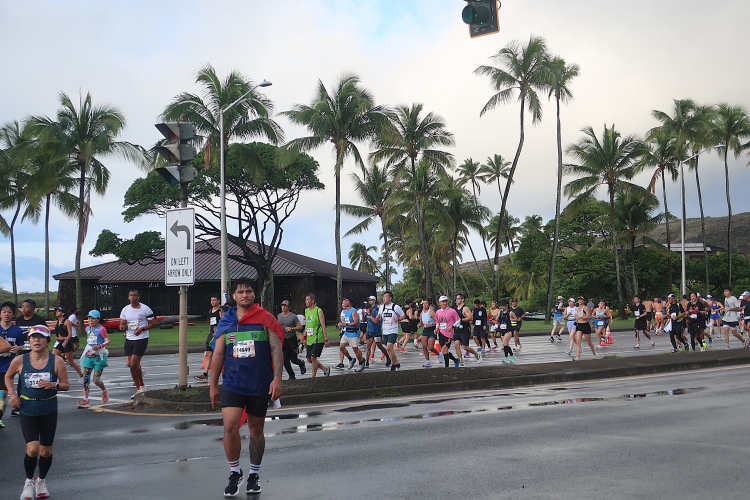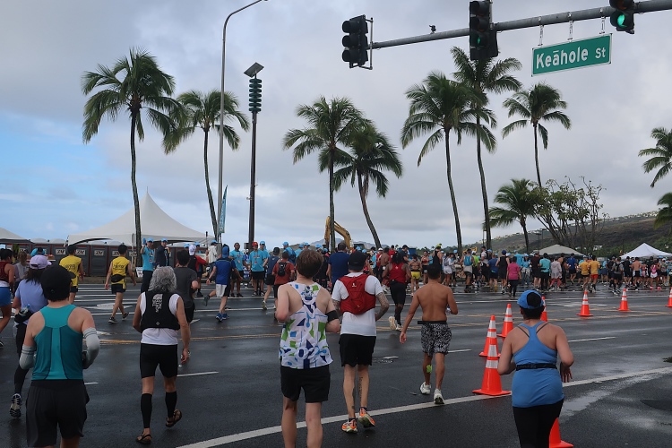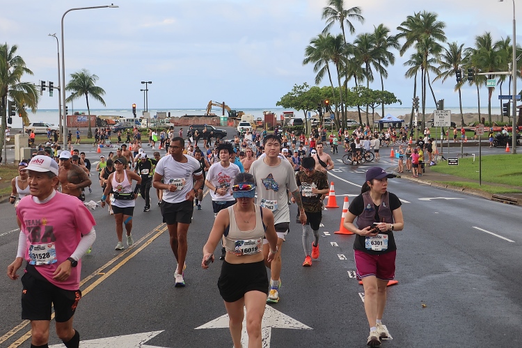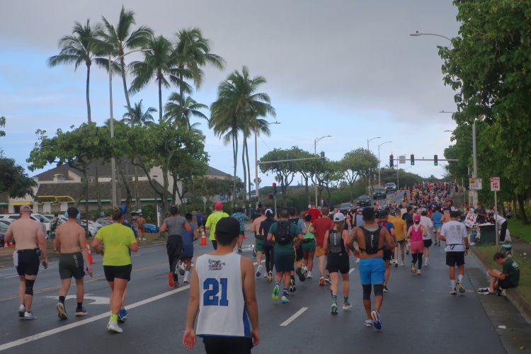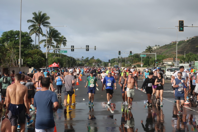 Nach zehn Kilometern ist das Ende des Strandes und auch das Ziel erreicht – aber nur für die 10 km-Läufer, die hier ausgeleitet werden. Für den Rest heißt es Abschied zu nehmen von Waikiki und dem Strand. Zugegebenermaßen fällt kaum auf, dass die 10 km-Läufer aus dem Feld herausfallen. Die Straße ist in der gesamten Breite auch weiterhin gut gefüllt.