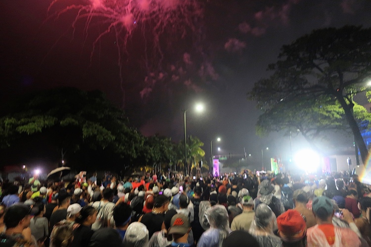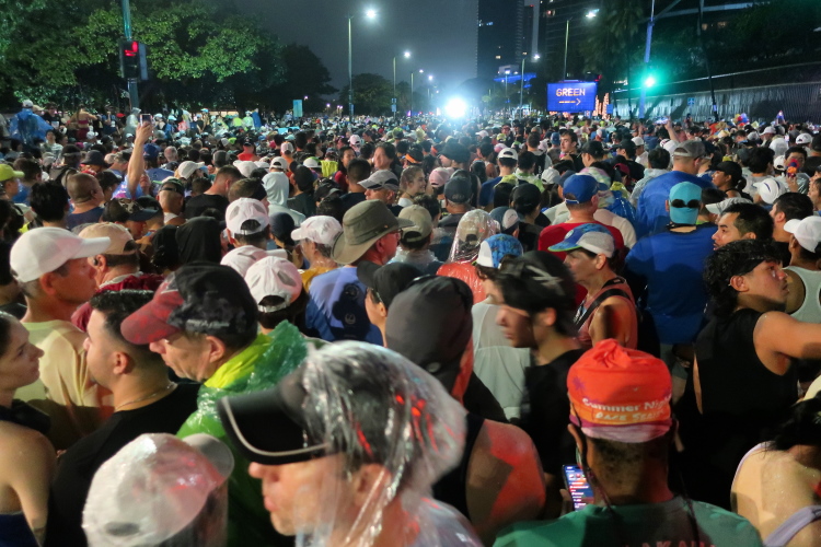 Der Regen lässt zum Glück irgendwann nach und nun drängen die wartenden Massen hinaus auf den Boulevard. Eine unübersehbare Menschenmenge sammelt sich dicht gedrängt hier. Pitschnass sind die meisten schon, aber die Stimmung ist bestens. Und die steigert sich nochmals, als es mit dem Startschuss um 5:00 Uhr am Himmel laut und hell wird. Traditionell wird der Marathon mit einem Feuerwerk eingeläutet. Es blitzt und funkelt nur so, unablässig jagen pfeifend die Raketensalven gen Firmament, um dort krachend ein farbenprächtiges Funkenspektakel zu verbreiten. Was für ein spektakulärer Auftakt! Vom Feuerwerk begleitet nähere ich mich in Minischritten der sich langsam nähernden Startlinie. Nach ein paar Minuten ist sie erreicht und dann, endlich, geht es richtig los. Entspannt jogge ich hinaus in die laue Nacht.