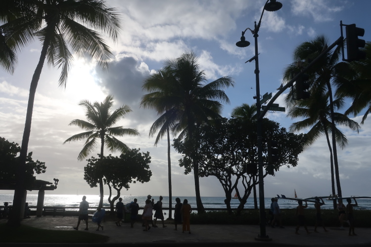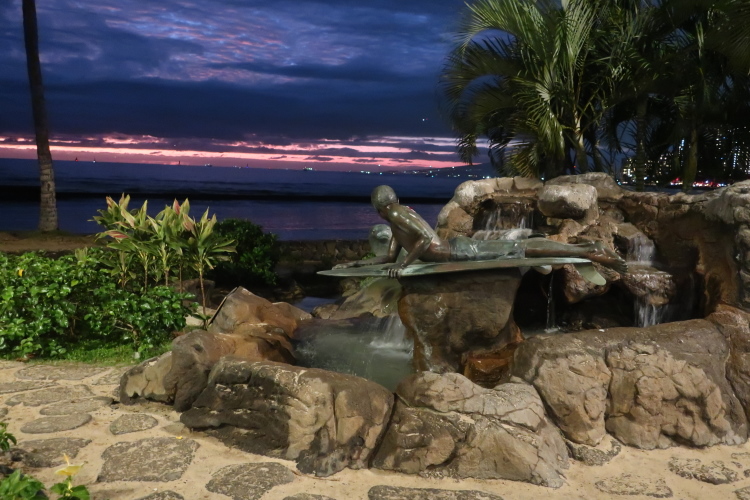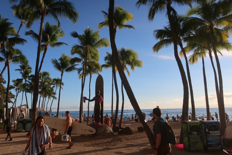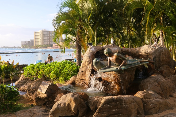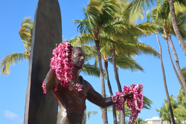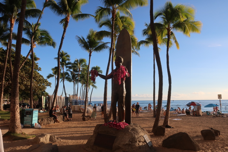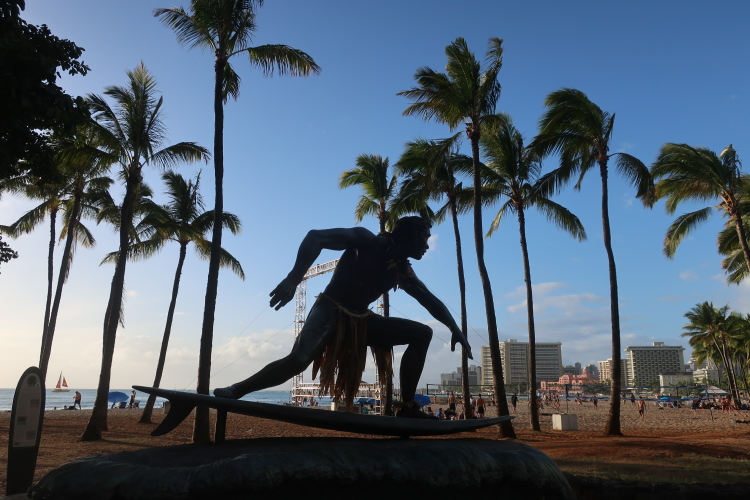 Etwa neun Kilometer liegen hinter mir, als ich, jenseits des Moana Surfrider, Waikikis ältestem und auch zu Nachtzeiten herrschaftlich erstrahlendem Hotel aus dem Jahr 1901, im Licht der Straßenbeleuchtung die hohen schlanken Palmen des weltberühmten Waikiki Beach im frühmorgendlichen Wind wiegen sehe. Sechs Uhr ist es zwar mittlerweile, aber noch immer finster, sodass Strand und Meer meinem Blick weitestgehend verborgen bleiben. Einsam auf einem Felsblock thront die Statue von Duke Paoa Kahanamoku zwischen den Palmen am Strandzugang. Mit ausgebreiteten Armen und blumengeschmückt begrüßt der einst berühmte Surfer und Olympiasieger die Strandbesucher.