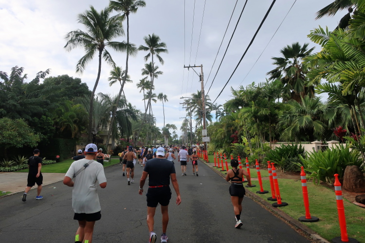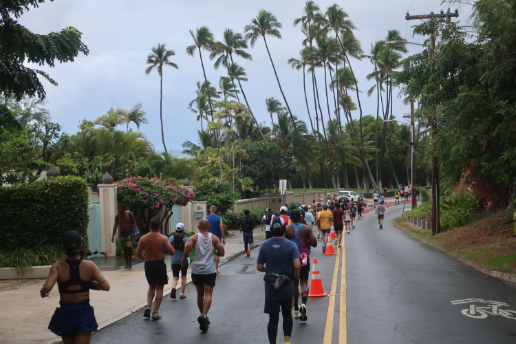 Nach 35,5 km verlassen wir den Highway, folgen ab hier aber nicht mehr dem Kurs des Hinweges, sondern biegen in die beschauliche Kealaolu Avenue ab. Diese passiert den Waialae Country Club, wo das Hawaiian Open PGA Golf Tournament stattfindet. Am Ende der Straße biegt die Route nach rechts in die Kahala Avenue ab und führt entlang des Kahala Beach durch ein Viertel mit luxuriösen Anwesen. In dieser proper-beschaulichen Gegend sind als zusätzliche Motivation in klangsicheren Abständen mehrere DJs am Straßenrand platziert, die den Laufkurs mittels kräftiger Lautsprecherboxen mit ihrem jeweils ganz eigenen Beat beschallen.