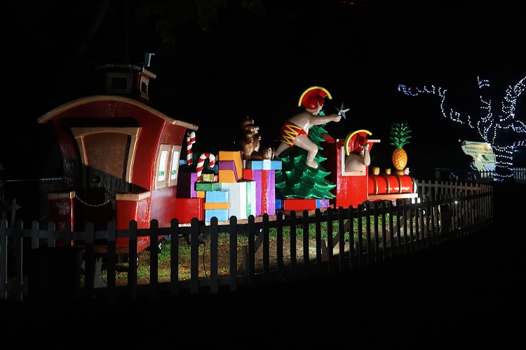 Nicht am Licht gespart wird allerdings bei der Illuminierung der von Lichterketten eingefassten Bäume. Und auch dort nicht, wo weihnachtliche Deko das Straßenbild ziert. Knallbunt ist sie und unter Ästhetikgesichtspunkten der Kategorie totaler Kitsch zuzuordnen. Aber jetzt in der Nacht ist das im Vorbeilaufen durchaus nett anzusehen.