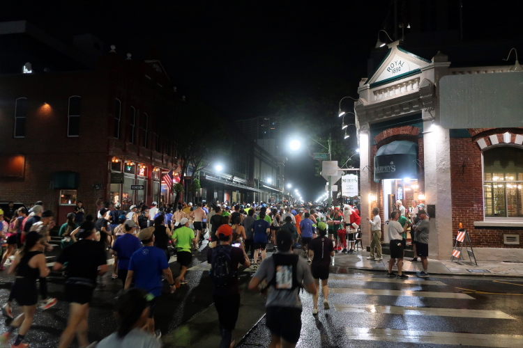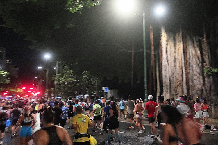 Nach drei Kilometern biegen wir nach rechts in die Chinatown ab und folgen dann der durch die Innenstadt führenden South King Street. Auf diesem Streckenabschnitt passieren wir einige weitere historische Highlights der Stadt. So etwa prangt inmitten eines Parks nach 3,5 km der Iolani-Palast, die Residenz des letzten hawaiianischen Königs und der einzige Königspalast auf amerikanischem Boden, im Scheinwerferlicht. Hier ist auch die erste von 16 Verpflegungsstellen entlang der Strecke positioniert. Von der Verpflegung darf man sich – wie bei US-Marathons üblich - nicht viel erwarten: Wasser gibt es immer, Isodrink an jedem zweiten Posten, Gels nur ab und zu. Und sonst … nichts. Selbstversorgung ist angesagt, wenn man unterwegs etwas zu beißen braucht.