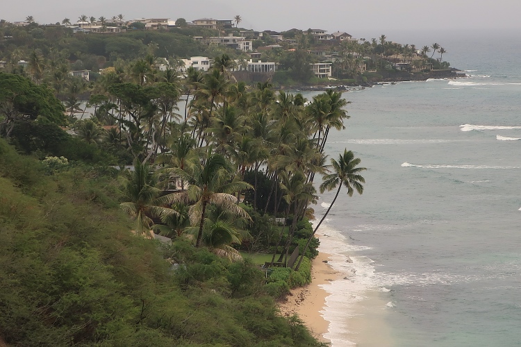 Waialae Iki, Aina Haina und Niu Valley heißen die Stadtbezirke, die wir auf dem Highway passieren. Sie ziehen sich zu unserer Linken an steilen Hängen hinauf und bieten ihren Bewohnern reichlich Meerblick. Die Hügelkuppen verschwinden heute in den tief hängenden Wolken. Viel Grün säumt den Kurs, doch ist er auch durch landschaftliche Monotonie gekennzeichnet. Kleine Uferparks eröffnen ab und an kurzen Meerblick, doch wirklich nahe kommen wir dem Meer nie.