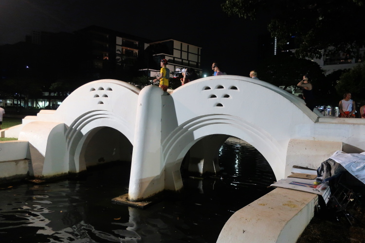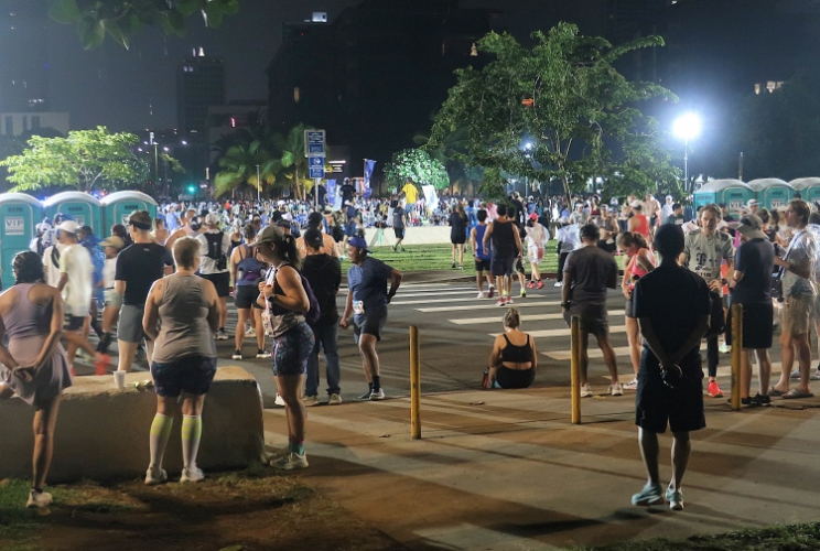 Ziel der Fahrt ist der westlich von Waikiki gelegene Ala Moana Boulevard, eingerahmt vom gleichnamigen Beach Park und dem riesigen Ala Moana Shopping Center. „Weg am Meer“ bedeutet auf Hawaiianisch Ala Moana, eine treffende Beschreibung auch für die Ausrichtung des Laufkurses. Vom Drop Off-Punkt setzt sich der nächtliche Walk ein paar hundert Meter fort, ehe mir ein von starken Strahlern ausgeleuchtetes Areal im Park zeigt: Ich bin da.