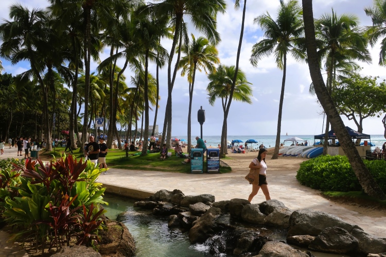 Die Brücke über den Ala Wai Canal markiert den Eingang zu Waikiki. Dieser Kanal trennt Waikiki quasi vom Rest der Stadt ab. Hotel- und Appartementtürme säumen die Straßenschlucht des Ala Moana Boulevards. Nahe am Meer sind wir hier zwar, aber die Bebauung riegelt jegliche Aussicht blickdicht ab.