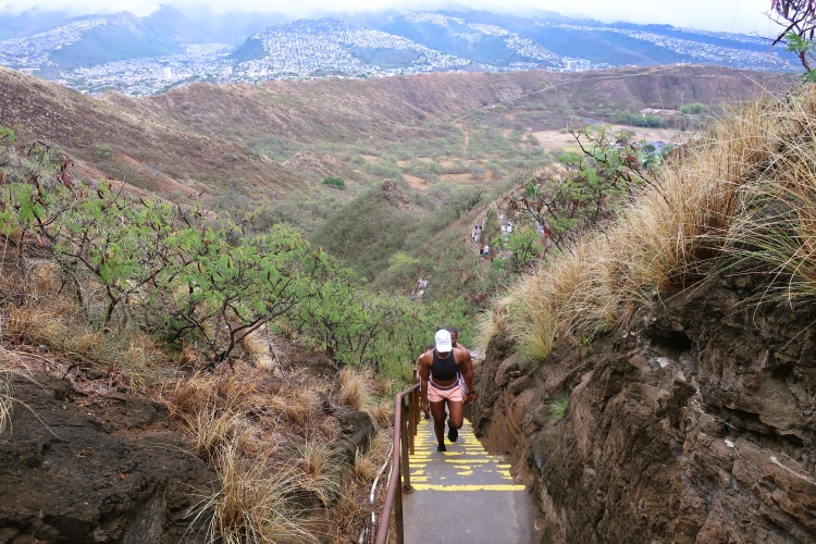 Besonders markant ragt am nahen Horizont der vulkanische Kegel des Koko Craters 300 Meter in die Höhe. Bekannt ist der Koko Crater vor allem durch seine direttissima und überaus steil zum Gipfel hinaufführende Bahntrasse, die einst der Materialanlieferung für eine Radarstation diente. Die schon lange stillgelegte und mittlerweile etwas marode Trasse dient heute als Wanderweg mit dem „speziellen Kick“, wobei Warnschilder deutlich auf die mit der Erklimmung der über tausend Schwellen verbundenen Unfallgefahren hinweisen. Das herausfordernde Abenteuer einer Besteigung in praller Sonne ist aber durchaus beliebt – ich habe mich selbst davon zwei Tage vorher überzeugt. Und das daraus resultierende Ziehen in den Waden mit auf die Marathonstrecke genommen.