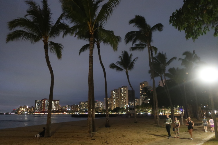 Nur einen knappen Kilometer geht es hier direkt am Strand entlang. Tagsüber drängen sich Touristen, Sonnenanbeter und Surfer dicht an dicht, jetzt übertönt nur das Rauschen der Brandung die Stille auf dem Strand. Einerseits bedauere ich, den Strand nicht im ersten Morgenlicht erleben zu dürfen, freue mich aber andererseits, weil es einfach gut läuft. Wenn Ihr Euch ein Bild von all dem machen wollt, was man entlang der bisher gelaufenen Wegstrecke bei Tageslicht zu sehen bekommt, schaut Euch einfach die Bilder im Eingangskapitel „Honolulu“ an.