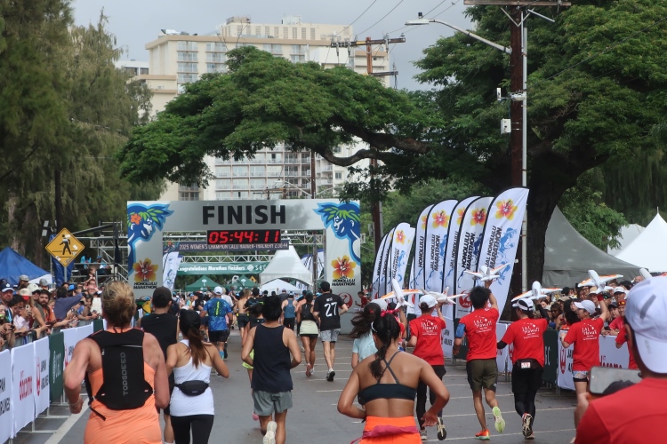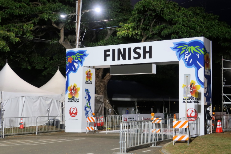 Vorbei am Leuchtturm geht es nun nurmehr bergab und ich höre ab jetzt nicht mehr auf zu laufen. An der Spitze des Kapiolani Parks biegen wir in die Kalakaua Avenue ab, wo ich einige hundert Meter entfernt am Ende der langen, entlang des Parks führenden Geraden schon den Zielbogen erspähen kann. Je mehr ich mich diesem nähere, desto mehr Menschen säumen die Straße und desto lauter wird die Geräuschkulisse, die uns auf den letzten Metern gen Ziel pusht.