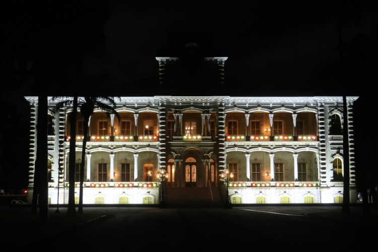 Schräg gegenüber auf der anderen Straßenseite erblicke ich die vergoldete Statue von König Kamehameha, des ersten Königs von Hawaii, vor dem historischen Ali´iolani Hale, dem Obersten Gerichtshof von Hawaii. Einige Palmen verleihen dem hübschen Ensemble den passenden exotischen Touch. Die nächtliche Ausleuchtung ist allerdings sparsam. Sie entfällt gänzlich, als wir ein kleines Stück weiter die mit Korallenblöcken aus den nahe gelegenen Riffen bis Mitte des 19. Jahrhunderts erbaute Kawaiaha´o-Kirche, einst die erste christliche Kirche auf Oahu, passieren. Das weiß ich auch nur deshalb, weil ich schon bei Tageslicht hier war.