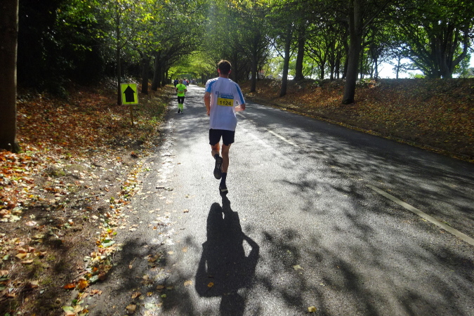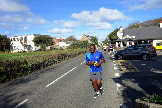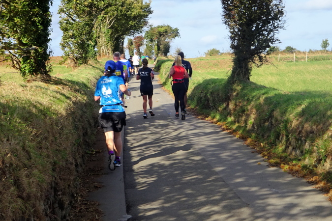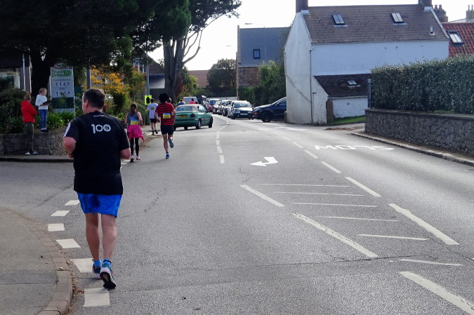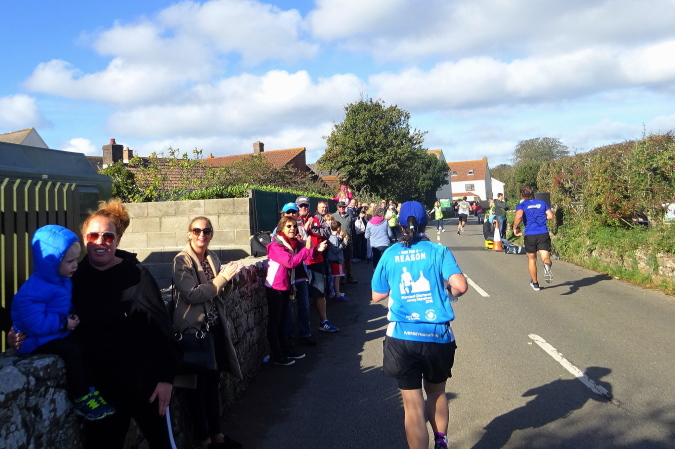 Bei der Quennevais School führt der Marathonkurs wieder zurück auf den Railway Walk. Hier ist die vierte Wechselstelle für die Staffelläufer, die immer noch recht zahlreich auf ihren Einsatz warten. Die Eintreffenden werden nach der Startnummer angekündigt, sodass sich die Wartenden besser einstellen können. Nun geht es vom Plateau hinunter auf das Küstenniveau, das Gefälle kommt mir entgegen, denn abwärts kann ich immer zulegen. Nur die jetzt losgeschickten Staffelläufer preschen allen davon – fast alle, denn ich hole beim Boat House einige wieder ein.