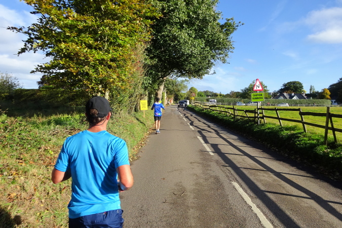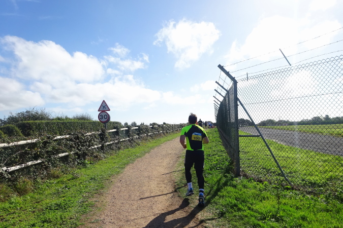 Bei der 14-Meilen-Tafel führt der Marathonkurs entlang dem eingezäunten Airport, der als „restricted zone“ deklariert ist. Wir laufen auf sandigem, aber festem Untergrund. Ich blicke zurück – Jorma und Reino haben aufgeschlossen. Sie laufen ein konstantes Tempo, ich muss sie ziehen lassen. Die Landschaft hier ist so schön, dass der Jersey Marathon ein Lauf für Genießer sein kann, außer man hetzt sich in der Staffel ab oder plagt sich als Eliteläufer. Nach 24,3 km zeigt meine Garmin 2:43 Stunden an, in Anbetracht des welligen Streckenverlaufes und einer gewissen Zurückhaltung meinerseits ist das ok.