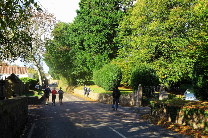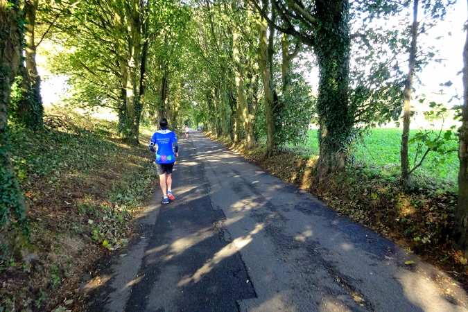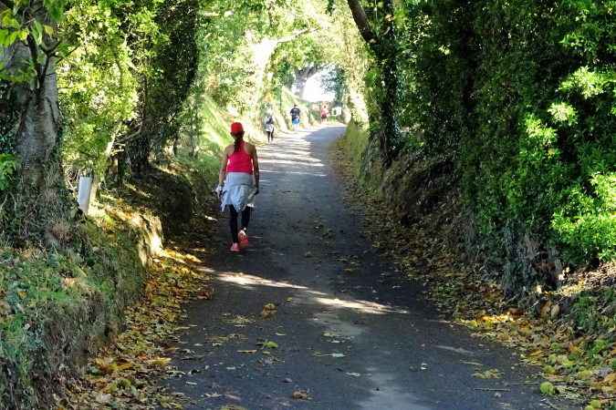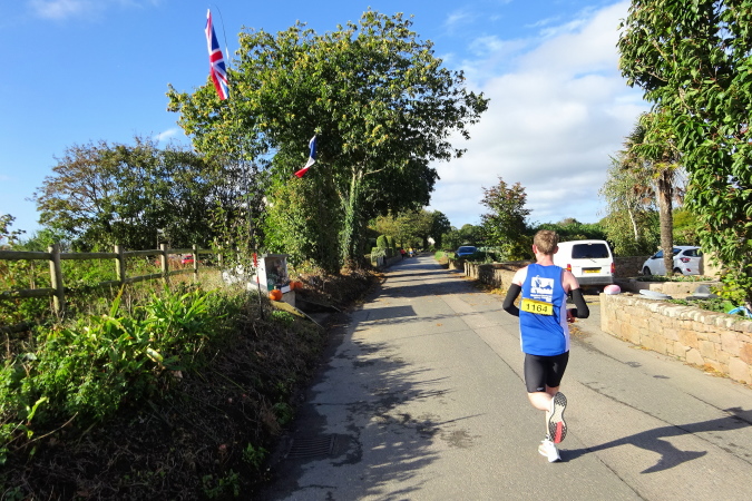 Der Platzsprecher hält eine Ansprache, er listet jene Länder auf, aus denen die Starterinnen und Starter beim Marathon kommen – immerhin sind auch aus Australien welche angereist. Der Marathonkurs ist derselbe wie in den letzten Jahren, darauf wird auf der homepage extra hingewiesen. Wenn man sich die Abbildung der Strecke genauer ansieht, fallen einem die Höhenmeter in Form eines Wellentals mit vielen kleinen Zacken auf. Der Jersey Marathon ist keinesfalls ein Spaziergang an der Waterfront, sondern führt von der Küste hinauf auf das hügelige Plateau. Doch vorerst laufen wir in einer Schleife eine kurze Runde durch die Innenstadt und die engen Gassen der Fußgängerzone. Aber bald sind wir aus der Stadt draußen und laufen entlang der St. Aubin Bay. Die erste Labestelle befindet sich nach zwei Meilen – der Marathon wird in Meilen, wie im UK üblich, ausgeschildert. Es gibt Wasser in 0,3 l-Flaschen. Der Anstieg auf dem „Le Chemin de Moulins“, ein infolge des gestrigen Sturms mit vielen heruntergebrochenen Ästen übersäte, asphaltierte schmale Straße führt durch ein dicht bewachsenes Tal, vorbei an einem Stausee mit einer großen Entenpopulation, deren Gequake uns begleitet.