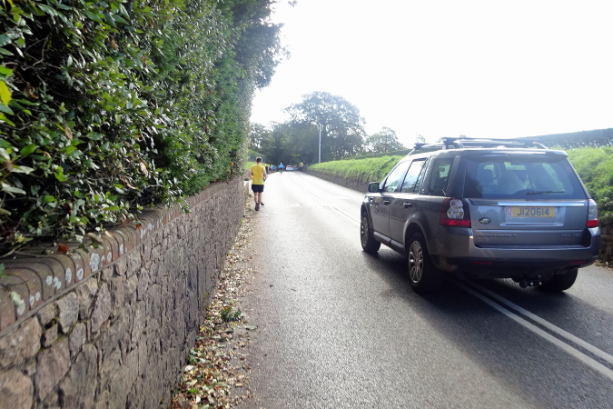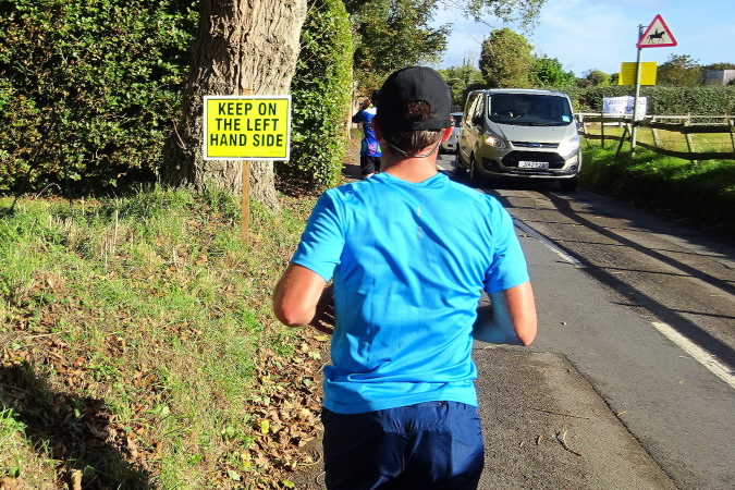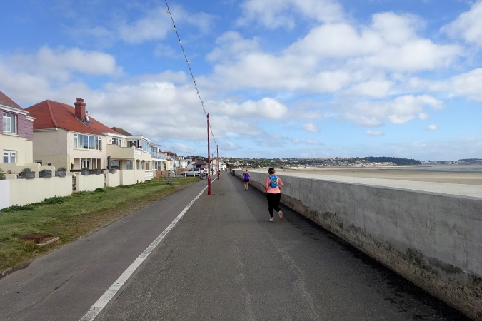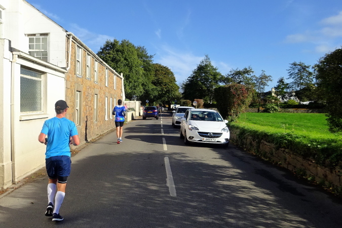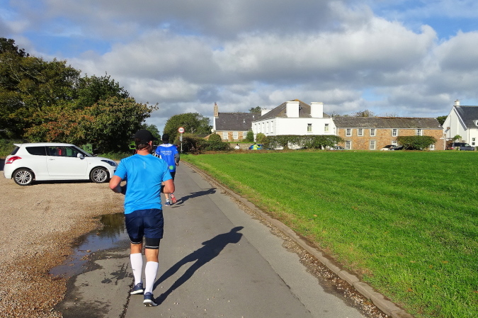 18 Meilen, ca. 30 km, sind erreicht. Bis zum äußerst westlichen Punkt in der St. Quen’s Bay, dem Leuchtturm, wo man den Sonnenuntergang erleben kann, laufen wir nicht. Eine 180 Grad-Wende führt uns nach Osten zurück in Richtung St. Helier. Es sind die Staffelläufer, die nun nachkommen. Ja, so ausgeruht müsste man sein, dann wäre es leicht, den Zehner in 60 Minuten zu laufen. Aber es liegen noch 11 km vor uns, für 31 km habe ich laut GPS-Uhr 3:31 Stunden benötigt. Wenn sich heute eine sub 5 h-Zeit nicht ausgeht, wann dann? Es geht weiter durch bewohntes Gebiet auf Asphaltstraßen, hinter uns fahren die Autos nach. Manchmal kann man auf einen Gehsteig ausweichen.