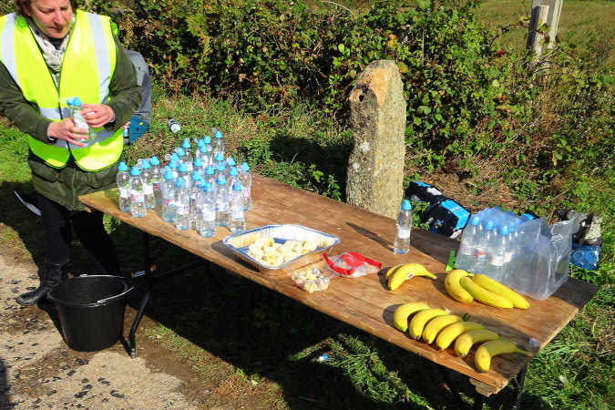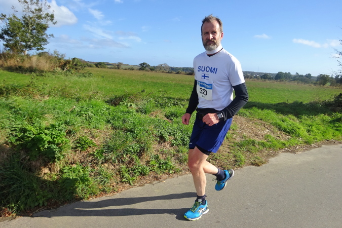 Bald nähern wir uns der zweiten Wechselstelle für die Staffelläufer, ca. 15 km sind erreicht, ich bin unter 1:40 geblieben. Esa aus Finnland ( der mit 500+ gelaufenen Marathons) hat zu mir aufgeschlossen und zieht vorbei. Ich laufe eine Zeitlang knapp hinter ihm, muss ihn aber ziehen lassen. Auf der Route de Vinchellez führt der Kurs bis zum äußersten nordwestlichen Abschnitt der Insel, dann erfolgt die Wende – es geht wieder zurück in südliche Richtung. Die bisherige Streckenführung auf Asphalt am Plateau ist auf ziemlich welligem Terrain verlaufen, kleinere Trailabschnitte stehen uns noch bevor. Bei der nun fünften Versorgungstelle gibt es jetzt auch Bananenstücke.