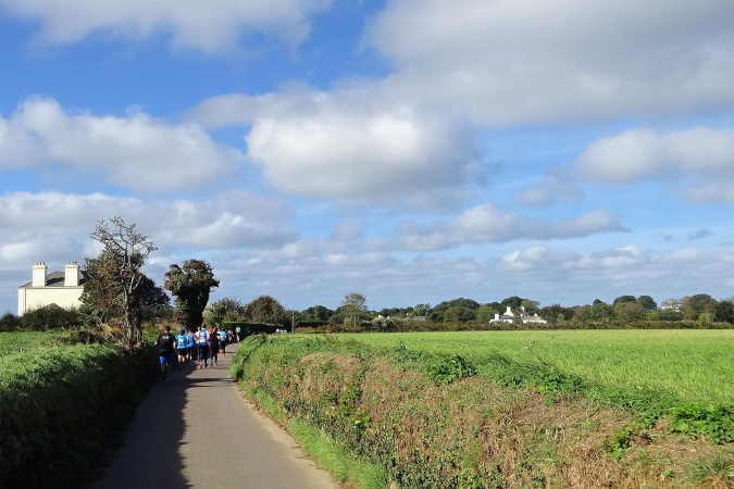 Oben am Plateau im Ortsteil von St. Lawrence angekommen, ist man ob der schönen Landschaft überrascht, wenn nicht sogar beeindruckt. Das durch den Golfstrom milde Klima hat eine Mischung aus mediterraner Vegetation und dem Pflanzenwuchs in gemäßigteren Breiten hervorgebracht. Man sieht Palmen, die den Winter überstehen und auch Nadelbäume, die sonst eher in größeren Höhenlagen zu finden sind. In den gepflegten Gärten der typisch englischen Ziegelhäuser ohne Verputz blühen um diese Jahreszeit noch Sommerblumen, die bei uns schon verwelkt sind. Die 120 km² große Insel mit rund 100.000 Einwohnern, die 150 km von Großbritannien und nur 25 km von Frankreich entfernt ist, wird am Plateau landwirtschaftlich genutzt, ausgedehnte Äcker, Wiesen und Weideflächen sind zu sehen. Zu meinem Erstaunen werden sogar wie bei uns in der Steiermark Kürbisse angebaut, geerntet und entlang der Lauftrasse auf Ständen zum Verkauf angeboten. Im Norden der Insel findet man steil abfallende Klippen, in deren Nähe der Marathonkurs führen wird.
