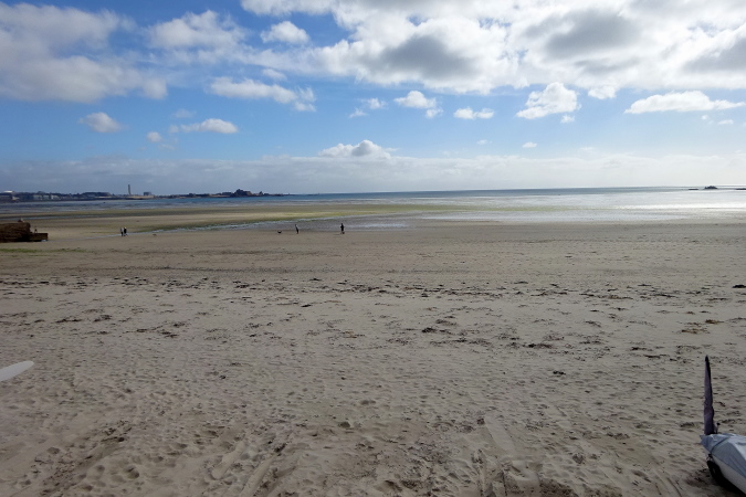 Eine Helferin schreit uns entgegen: „Now everything is flat, no hills anymore“. Wie recht sie hat, doch bis zum Ziel sind noch gut 5 km zurückzulegen. Bei Ebbe wirkt die Bucht wie ausgetrocknet, bei Flut steigt das Wasser um mehrere Meter an. Die Leute spazieren mit Hunden auf dem nassen, sandigen Untergrund. Ich werde nach dem Marathon hierher zurückkommen, um für meine große Sediment-Sammlung aus aller Welt auch 150 ml vom braunen Jersey-Sand mitzunehmen.