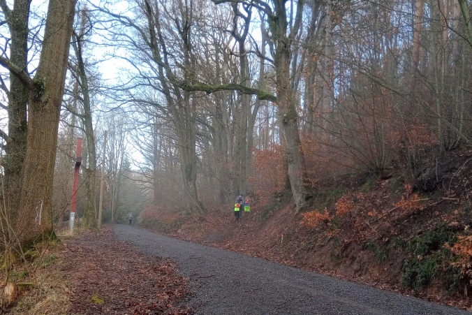 Du hast nun ¼ hinter dir und einen ordentlichen steilen Aufstieg heraus aus dem Talgrund vor dir. Hier haben sie auch ein paar Stufen, etwas Asphalt, aber oben dann breite Waldwege und holprige Trails, alles unter Bäumen. Die gute Aussicht zurück kommt später dazu. Dieses Teilstück hat ungefähr 10 km und so manche Falle zu bieten. Abzweige sind manchmal schwer zu finden, das GPS-Signal ist nicht soo genau und auch nicht soo flott. Wohl wegen der Bäume. Manche stellen sich dieser Herausforderung gern und intensivieren das Lauferlebnis durch reizvolle kleine Umwege…aber was solls, solange du in der cutoff-Zeit von 4,5 Stunden am VP2 ankommst, ist es egal.