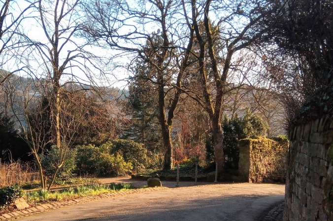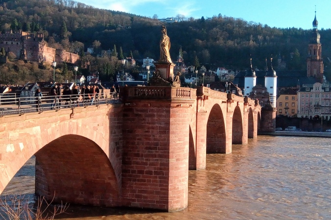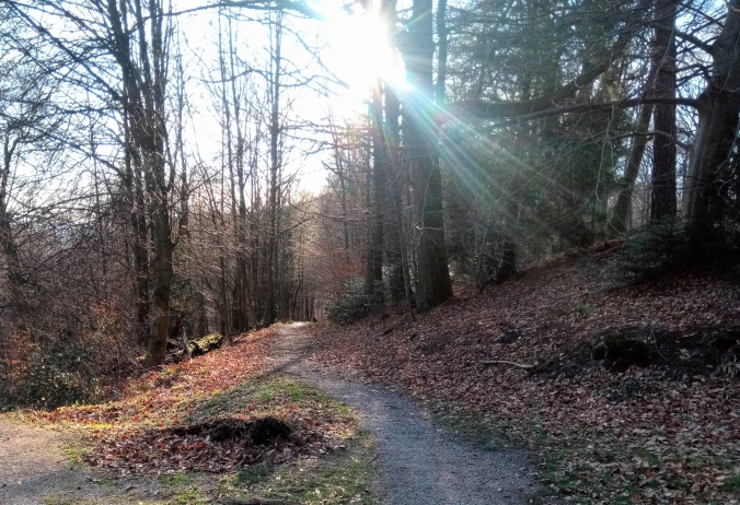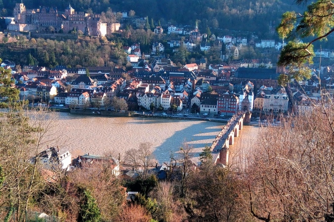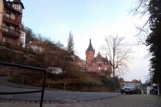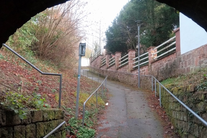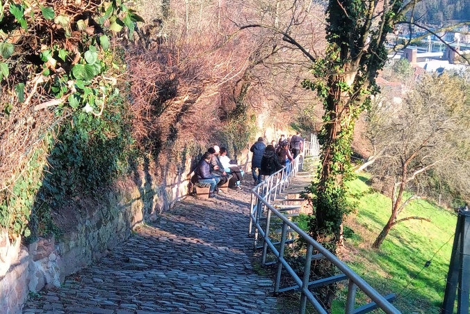 Hier kannst du nun zum Schlussspurt ansetzen, ab hier geht’s wirklich nur noch abwärts! Schmal ist der Pfad und Steine lauern im Laub. Weiter unten auf dem Philosophenweg und auf den Treppen vom Schlangenweg sind viele Spaziergänger. Eine Ampel bremst dich aus. Drücken und warten, sonst Knolle. Wäre blöd, jetzt.