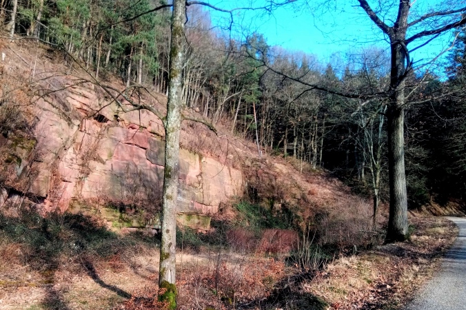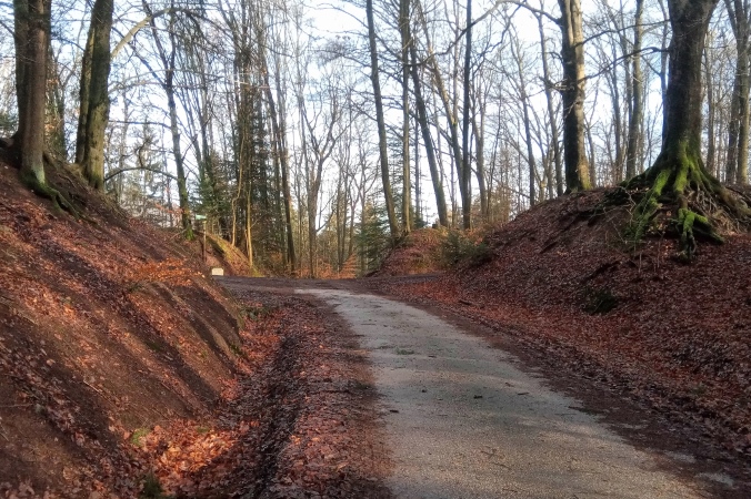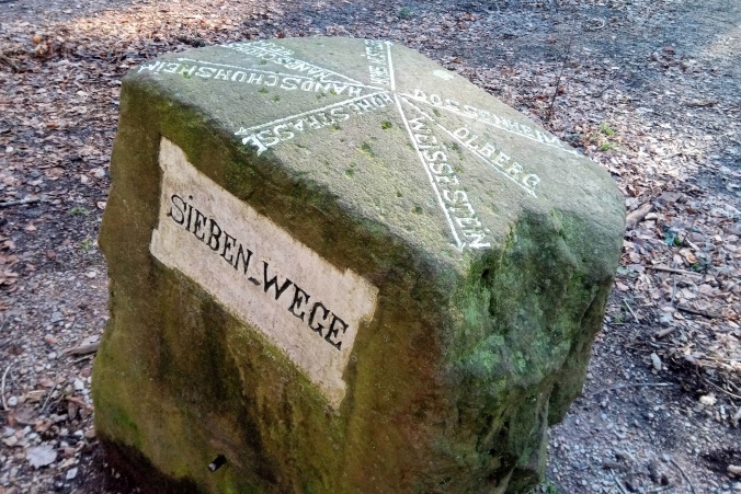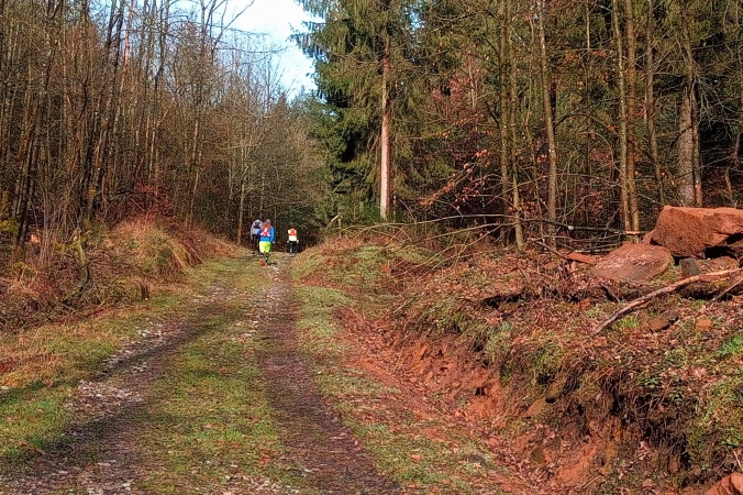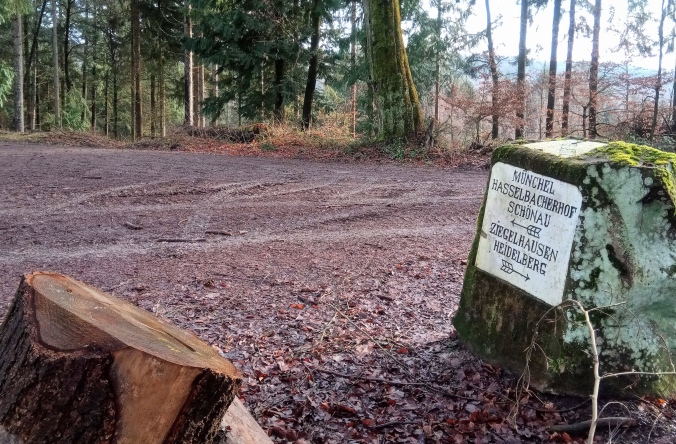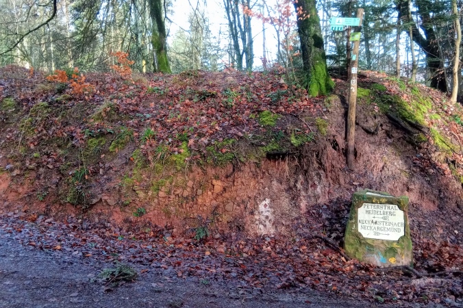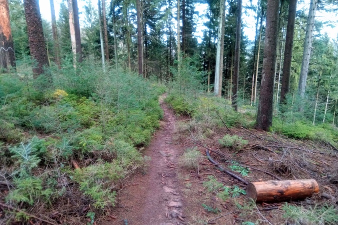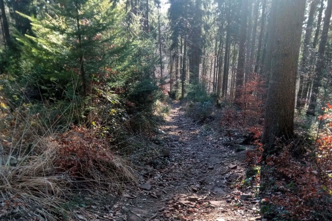 Nach der nötigen Stärkung (mit Erdbeeren als Desert) hast du noch gute 9 km bis zum Ziel. Bergab, so heißt es. Stimmt, aber nur netto. Tatsächlich darfst du erstmal noch 2 km schön aufwärts zum Weißen Stein mit Sendemast. Ab da geht’s dann runter über Stock und Stein. Der Trail ist schwer und holperig, in Gegenrichtung läufst du den beim Heidelberger Trailmarathon. Weiter geht’s am Siebenwegestein vorbei. Bitte nicht verlaufen hier und das letzte Trailstück genießen. Unten folgt noch ein knackiger Anstieg, 90 hm über den Grat hinweg.