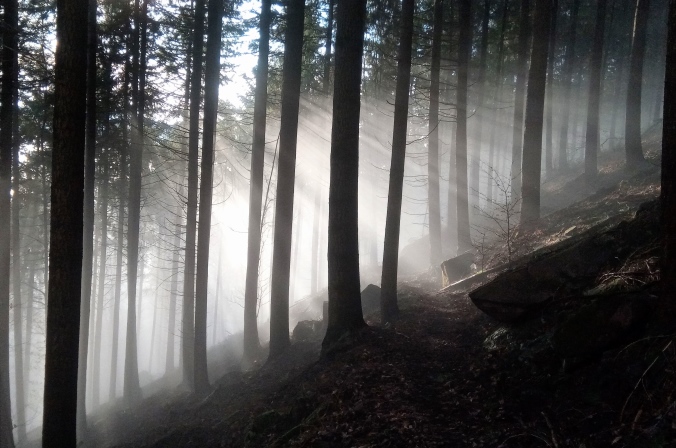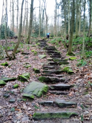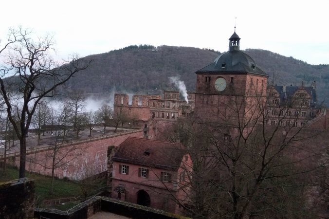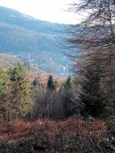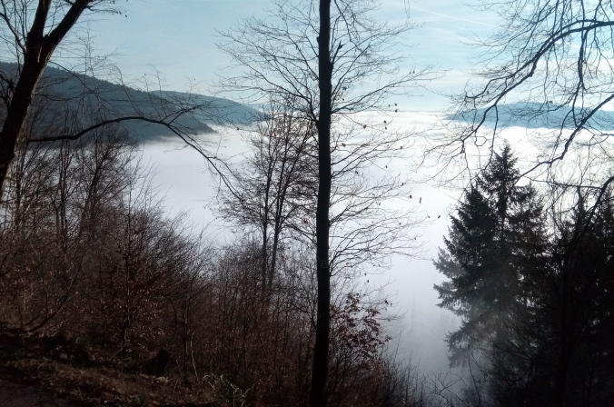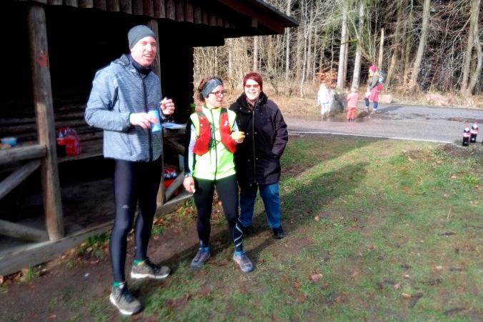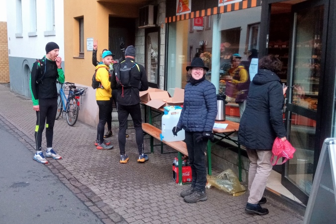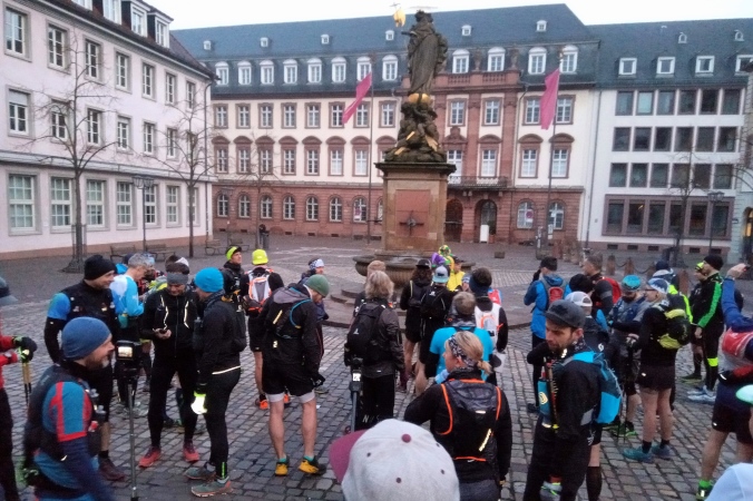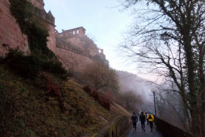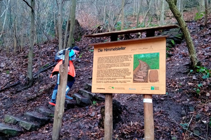 Kalter Nebel liegt quer über dem Neckartal. Ein Stück laufen wir in der Altstadt, dann zum Schloss rauf und zur Himmelsleiter. Die ersten Stufen sind sogar nummeriert. Insgesamt sollen es 15-1600 sein. Hoch zum Königsstuhl mit tollem Blick rüber ins Rheintal. Über den Wolken ist die Freiheit bekanntlich grenzenlos. Waldwege und Trails folgen, und wenn du nicht deine GPS-Mimik richtig abliest, bist du ganz schnell verkehrt. Beim Eintauchen in den Nebel wird’s wieder ganz schön kalt, deshalb schmeckt in Ziegelhausen am VP schmeckt der heiße Kaffee so richtig. Direkt vor einer Bäckerei, da bleibt kein Wunsch offen.