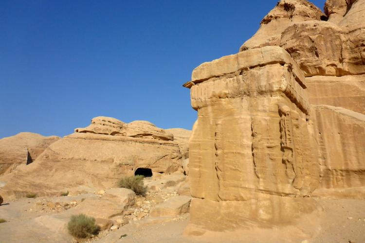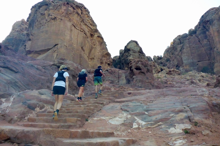 Im Gegensatz zu gestern haben wir die Ausgrabungen heute ganz für uns. An der sogenannten Fassadenstraße biegt unser Track ab zum hohen Opferplatz. Ina wartet mit anderen Begleitern auf uns. Hier gibt es auch Wasser. Bevor es in den Canyon geht, laufen wir noch die 500 Meter zum Schatzhaus. So viel Zeit muss sein. Dann geht es zum hohen Opferplatz steil nach oben. Die heiligen Treppen sind direkt in den Fels gehauen. Hinter uns im Tal leuchten die Königsgräber, die Royal Tombs. Eine hochgelegene Plattform diente früher als Opferstätte.