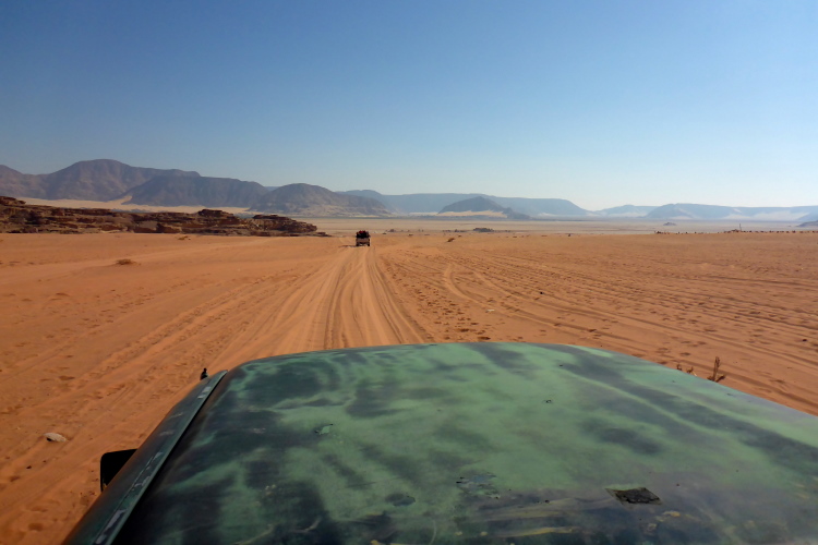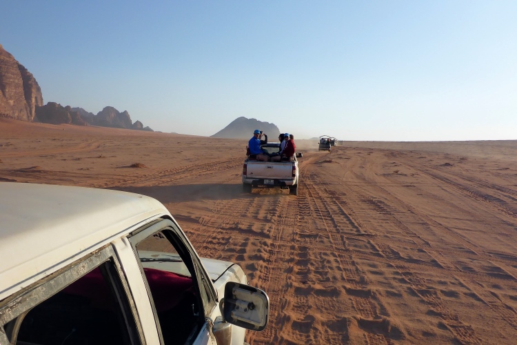 Diese bringen uns zum Start der nächsten Etappe nach Wadi Rum. Im Wadi Rum Village steigen wir um auf Pickups, die uns zu unserem Wüstencamp bringen.