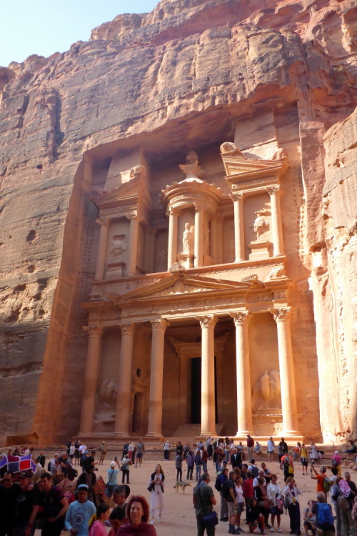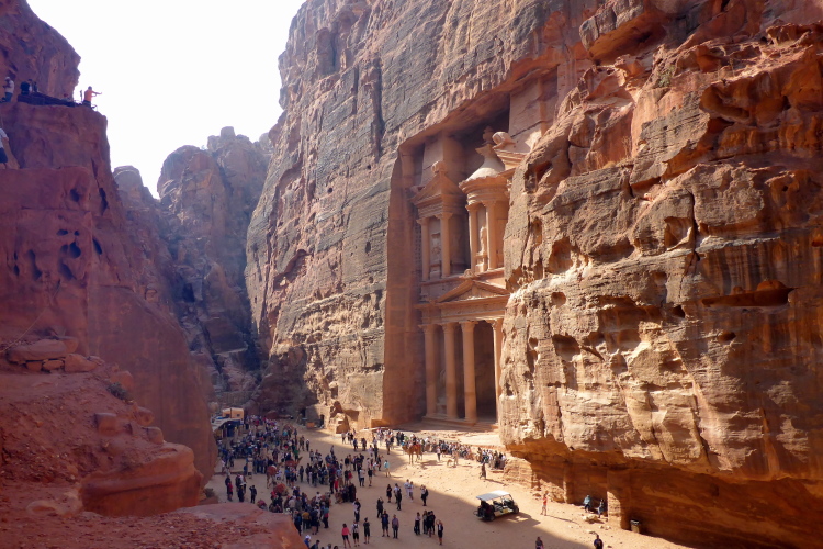 Alles um uns herum erscheint riesig und man muss schon genau hinschauen, um die bunten Shirts der Teilnehmer in dem Felsenchaos zu erkennen. Langsam wechselt die Kulisse. Der Stein wird jetzt rötlicher und wir laufen am Abgrund eines tiefen Canyons entlang. Wir erreichen das Kloster (Ad Deir), das wie die Schatzkammer aus dem Felsen gehauen wurde. Wir sind quasi am Hintereingang des Areals von Petra. Nach dem Kloster geht es in einen engen Spalt, der uns mit vielen Stufen in die Tiefe geleitet. Wir laufen vorbei an vielen Souvenirläden und so langsam bricht sich die Sonne den Weg in die Felsspalte. Eine magische Stimmung umgibt uns. Viel zu schnell erreichen wir das Tal und den römischen Tempel.