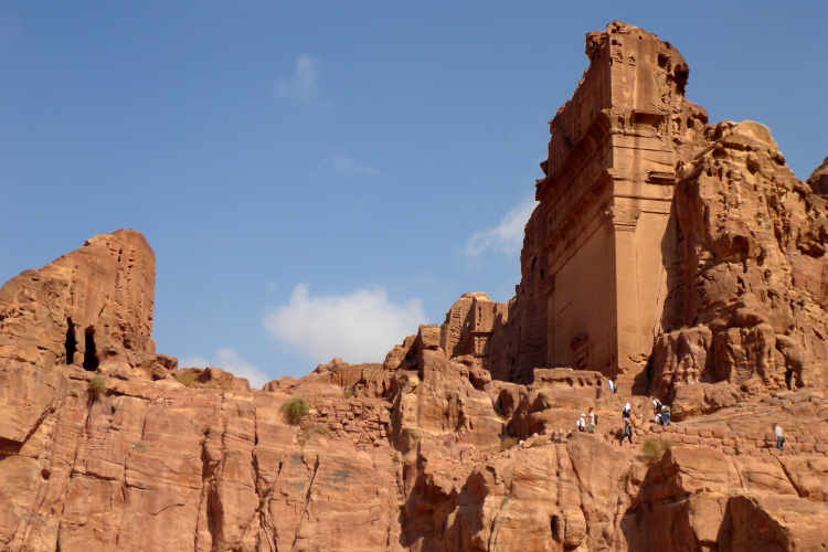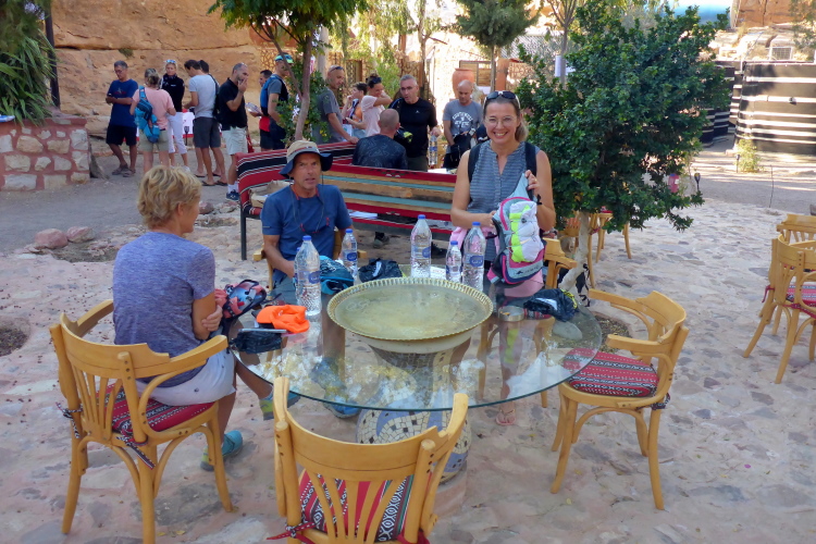 Weiter geht es vorbei an den Königsgräbern und die Schlucht öffnet sich wieder. Am Ende kommen wir auf eine breite Römerstraße. Ein Amphitheater und die Reste großer Paläste und Marktplätze erinnert an die römische Zeit in Petra. Wir genießen das Mittagessen unter schattigen Bäumen in einem großen Restaurant und schlendern danach wieder den gleichen Weg zurück zum Bus. Das war genau das richtige Programm zur Einstimmung.