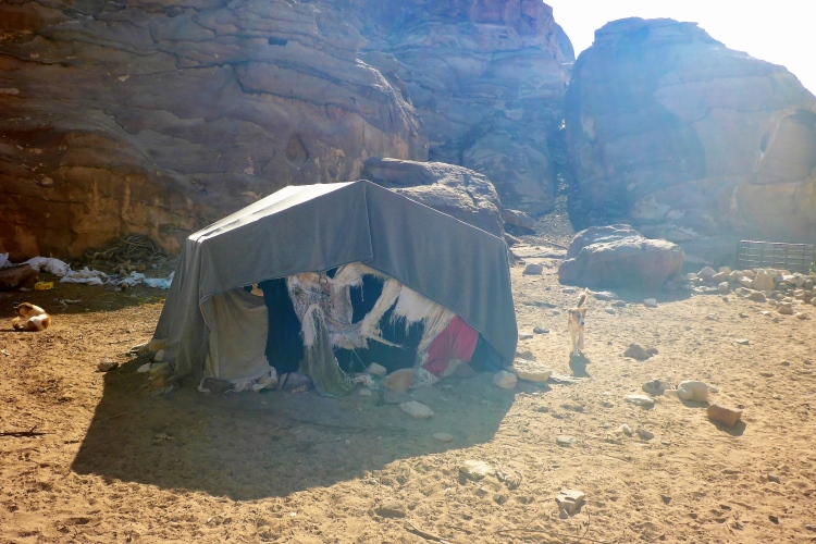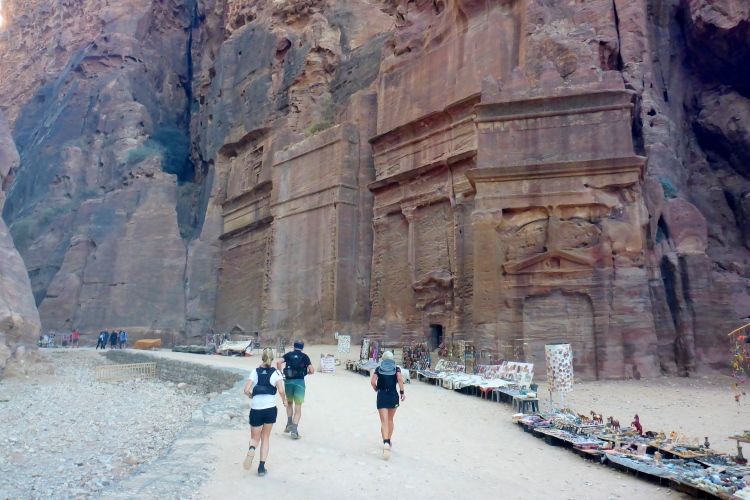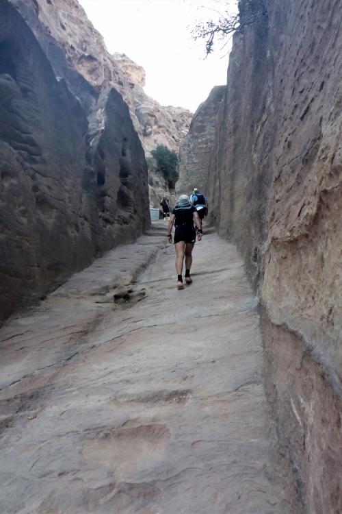 Wir sind auf dem Jordan Trail, der sich über 650 Kilometer durch das ganze Land zieht. Die Geröllberge lassen wir hinter uns und blicken in eine tiefe Schlucht, die uns nach Petra bringen wird. Der helle Sandstein wirkt sehr brüchig. Der kurvige Pfad führt uns mit vielen Stufen auf und ab durch die Schluchtenlandschaft. Das Panorama ist atemberaubend und hinter jeder Kurve überraschen immer neue Felsformationen. Die Souvenirläden und Cafés schlafen noch. Die Händler übernachten teilweise in Wohnhöhlen oder gleich im Zelt neben ihrem Stand. Außer uns ist noch niemand unterwegs.