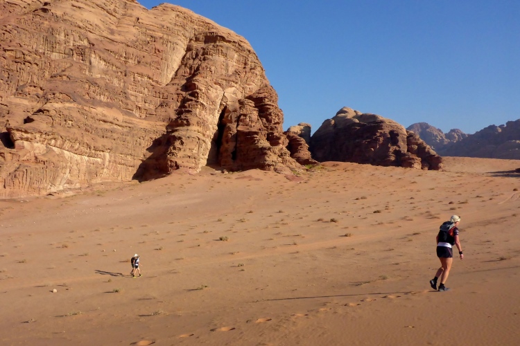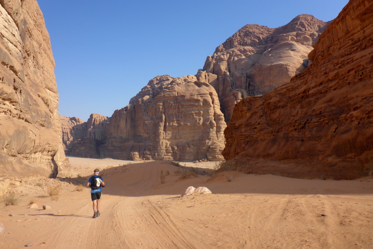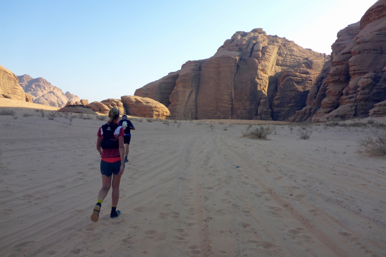 Die Sonne geht auf und die Felsriesen werfen lange Schatten auf die Ebene. So weit der Blick reicht gibt es nur Sand und Fels. In weiter Ferne erkennen wir schon die erste Verpflegungsstation. Zwei Beduinen sitzen am Lagerfeuer. Im Zelt können sich die Läuferinnen und Läufer der langen Distanz ausruhen, aber noch ist niemand von ihnen hier durchgekommen. Die führende Frau hat sich gestern wohl 20 Kilometer verlaufen, ist aber jetzt wieder auf der Strecke und immer noch in Führung. Unsere Flaschen sind noch voll und so geht es nach einer Cola gleich weiter. Der Rennarzt zeigt uns die Flagge, die den Einstieg in den langen sandigen Canyon markiert.