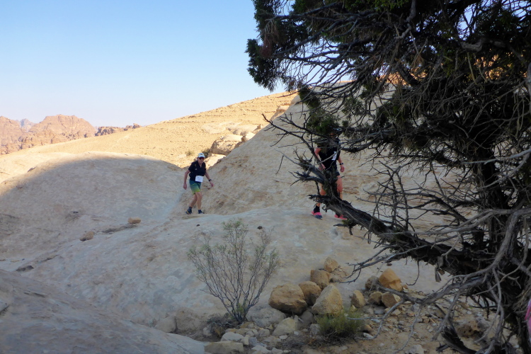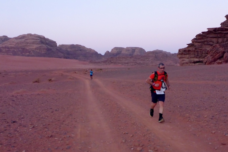 Schon früh fahren wir mit dem Bus zum Start der ersten Etappe. Wir starten am Rande von Little Pertra mit allen Teilnehmern. Man merkt die Anspannung der Läuferinnen und Läufer. Ich bin froh, als es endlich losgeht. Es ist stockdunkel. Wir folgen einem Fahrweg in die Berge. Hinter uns leuchten die Lichter von Little Petra. Wir sind auf einem Hochplateau aus dem einzelne Felsgiganten herausragen. Die heutige Etappe hat 25 Kilometer und einige Höhenmeter aufzuweisen und noch wissen wir nicht so recht, was uns erwartet. Also erst mal langsam machen und die Landschaft genießen. Schnell setzt die Dämmerung ein.