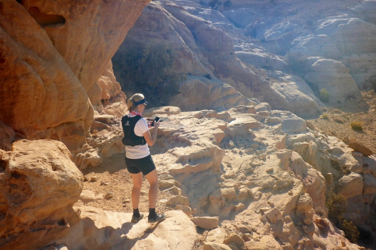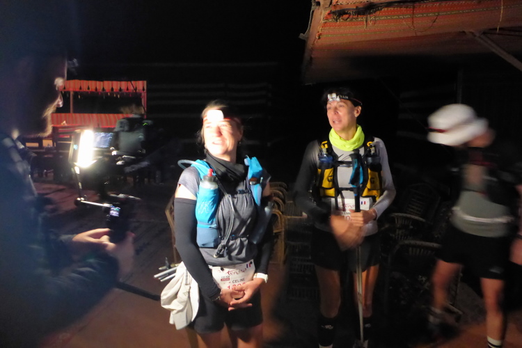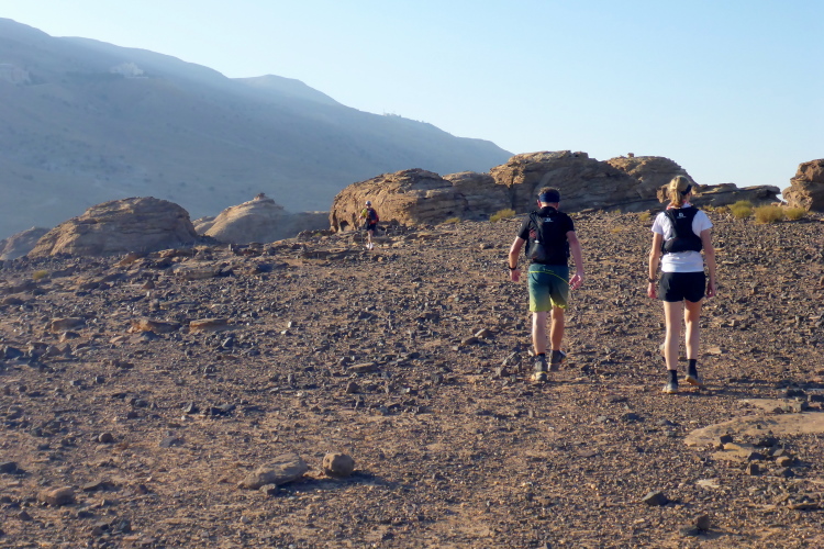 Nachdem wir die weite Ebene vor unserem Camp durchquert haben, beginnt bereits die Morgendämmerung. Astrid ist etwas angeschlagen mit Darmproblemen. Katja ist noch etwas platt von gestern. Ich fühle mich fantastisch. Burkhard müssen wir etwas einbremsen. Er macht von Anfang an ein hohes Tempo. Mit dem Sonnenaufgang erreichen wir die ersten Schluchten. Weichsand ist unser ständiger Begleiter und oft geht Laufen besser als Gehen. Unterwegs treffen wir auf Läufer der 185 km Strecke, die hier bereits 160 km zurückgelegt haben. Eine Wahnsinnsleistung.