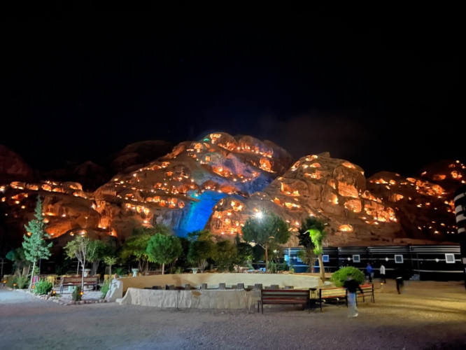 Am nächsten Morgen gibt es ein opulentes Frühstück in einem der Aufenthaltsräume, einer großen Höhle, die zu einem Gebäude umgestaltet wurde. Heute ist erst mal Sight Seeing angesagt. Zwei große Busse bringen die Teilnehmerinnen und Teilnehmer nach Petra, der legendären Wüstenstadt. Die Handelsstadt der Nabatäer entstand vor etwa zweitausend Jahren. Hier kreuzten sich wichtige Karawanenwege und der damit einhergehende Reichtum veranlasste die Bewohner, mit gewaltigen Gräbern, Tempeln und Palästen an ihre Macht zu erinnern. So wurden prächtige Fassaden in den roten Fels der Canyons geschlagen, von denen die des Schatzhauses wohl die berühmteste ist. Die letzten regelrechten Bewohner der Felsenstadt waren um 1180 die Kreuzritter. Nach deren Niederlage gegen Sultan Saladin verlor die Stadt jedoch an Bedeutung und versank in einem Dornröschenschlaf.