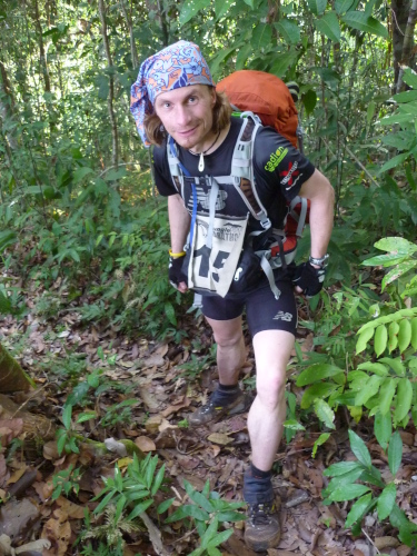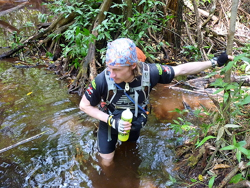Das Fortbewegen beim Jungle Marathon hat stellenweise nichts mehr mit Laufen zu tun: Stolpern, Klettern, Schliddern und Schwimmen sind angesagt. Vergiss jegliche Zeitvorgaben bei diesem Rennen, denn hier bekommt der Faktor Zeit eine ganz neue Dimension. Für einen Kilometer muss man schon einmal mit zwanzig Minuten und mehr rechnen. Auch, weil ich meine komplette Ausrüstung bei mir trage, inklusive Essensvorräte für sieben Tage. Ich bin in dieser Woche komplett auf mich selbst gestellt, was die Energiezufuhr anbelangt. Nur Wasser bekommen wir vom Veranstalter bereitgestellt. Das bedeutet insgesamt zwölf Kilogramm an Gewicht, was das Laufen enorm erschwert. Jeder zurückgelegte Meter kostet die doppelte Energie, besonders in dieser erbarmungslosen Umgebung.