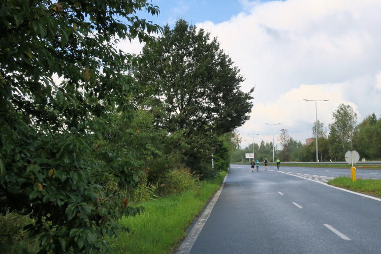 Der Kurs verläuft eine Zeitlang auf einer Nebenstraße parallel zur A4, bevor es wieder zurück in den Mischwald geht. Kurz vor Nikiszowiec, eine gut erhaltene und bewohnte Arbeitersiedlungen aus dem frühen 20. Jahrhundert, taucht die Baumwolljackenträgerin wieder auf. Hier kommt es zu einer Begegnungszone, wir laufen in den Ort hinein, die vor uns liegenden kommen eben raus. Auf dem gepflasterten Untergrund im Ortsgebiet lasse ich die Kollegin dann vor. Meine Füße brauchen Schonung, ich bewege mich mit Vorsicht auf dem unebenen Terrain.