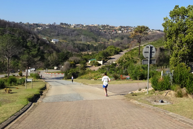 Beim Simola-Golfclub ist der höchste Punkt erreicht, die Aussicht von hier oben ist so weitläufig und schön wie bei uns der Blick von einer Anhöhe an einem klaren Herbsttag hinunter ins Tal. Auf den letzten 7 km wird es – wie man aus der Ferne erkennen kann – zunächst talabwärts gehen und dann entlang einer asphaltierten Durchzugstraße zum Zielbereich in Knysna. Die beiden M-50er, die mich vor einer Stunde schon überlaufen wollten, sind wieder nahe an mich herangekommen. Noch kann ich sie abwehren, aber nach der Labestation legen sie jenes Tempo vor, das geübte Ultraläufer so beherrschen – ein konstante 6er-Zeit am Ende eines Marathons. Sie sind einfach zu schnell für mich. Zwar komme ich auch selbst an mehreren nur mehr auf Gehen ausgerichtete Kollegen vorbei, aber auch bei mir ist die Luft inzwischen ziemlich draußen. Ein anderer M-60er will sich auf den letzten 4 km mit mir messen – diesen Wettkampf unter Altersgenossen nehme ich gerne an. Auf meiner Uhr sind 41 km schon erreicht, wir kommen zur letzten Labe offiziell 2 km vor dem Ziel.