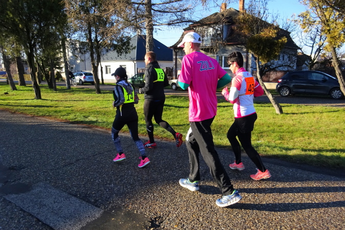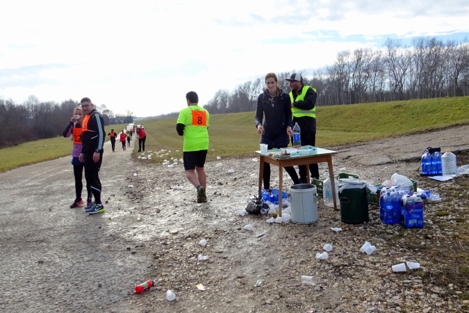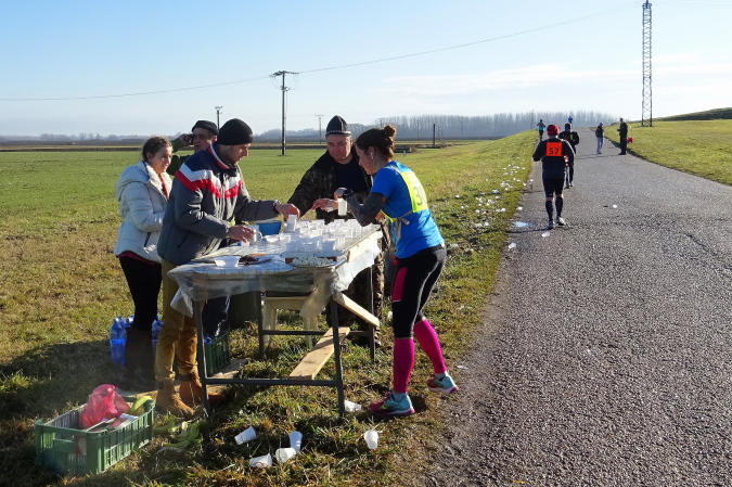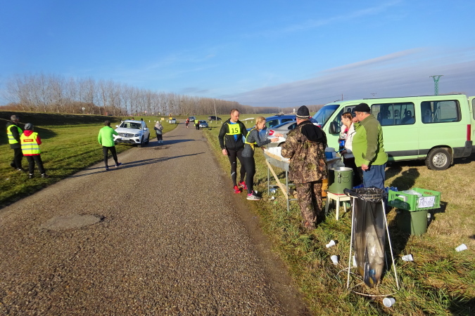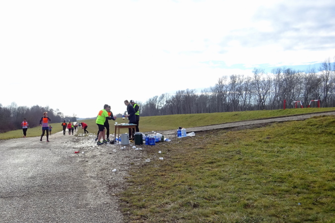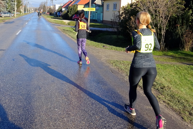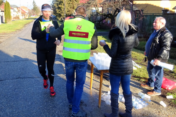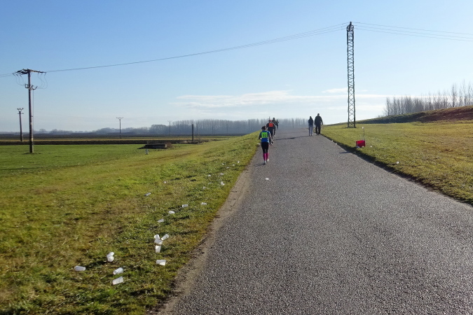 Die erste Labe befindet sich noch im Stadtgebiet. Ich bin nun schon die längste Zeit einmal vor, dann wieder hinter der Kollegin mit der Nummer 92 gelaufen. Bei einem Trinkstopp an der ersten Labe nach 5 km nicken wir uns zu. Eva ist im nahen Ungarn zu Hause und sagt mir, dass kein Marathon preislich so günstig zu bekommen sei wie eben hier in Kolárovo. Diese Einschätzung mag zutreffen, ist aber für mich kein Motiv teilzunehmen, vielmehr die kurze Anfahrtszeit und der Samstag als Marathontag, der mir einen „freien“ Sonntag ermöglicht.